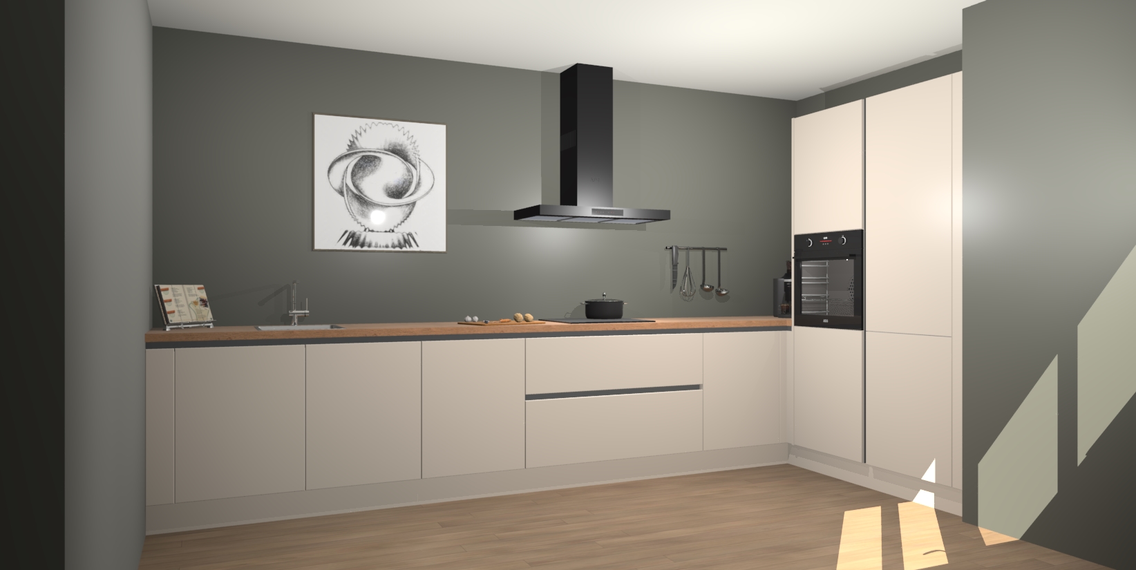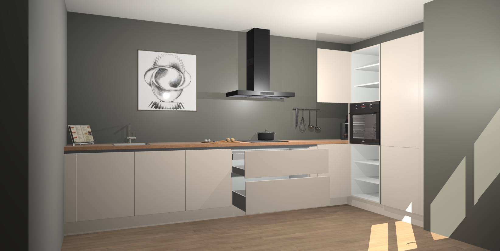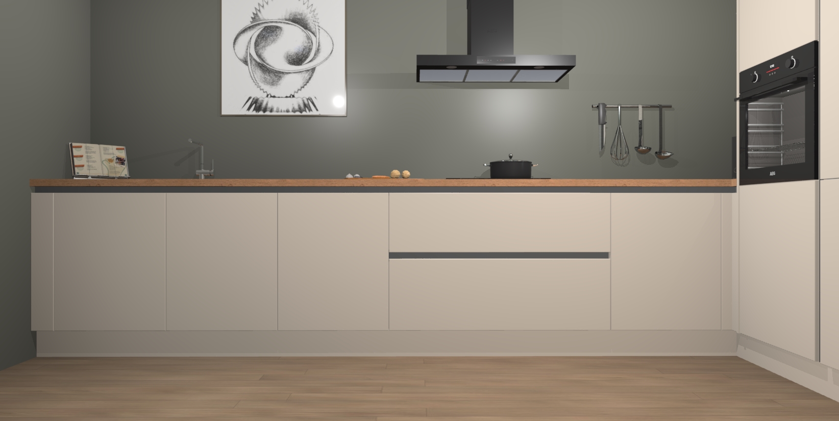 Welkom bij de Kasjmier greeploze keuken Khao Lak. Deze prachtige keuken zal de komende jaren het middelpunt van de belangstelling in uw huis zijn. Uitgerust met vijf inbouwapparaten komt u nooit kookgereedschap tekort. Bovendien geeft de warme houtlook elke ruimte een uitnodigende en tijdloze uitstraling.