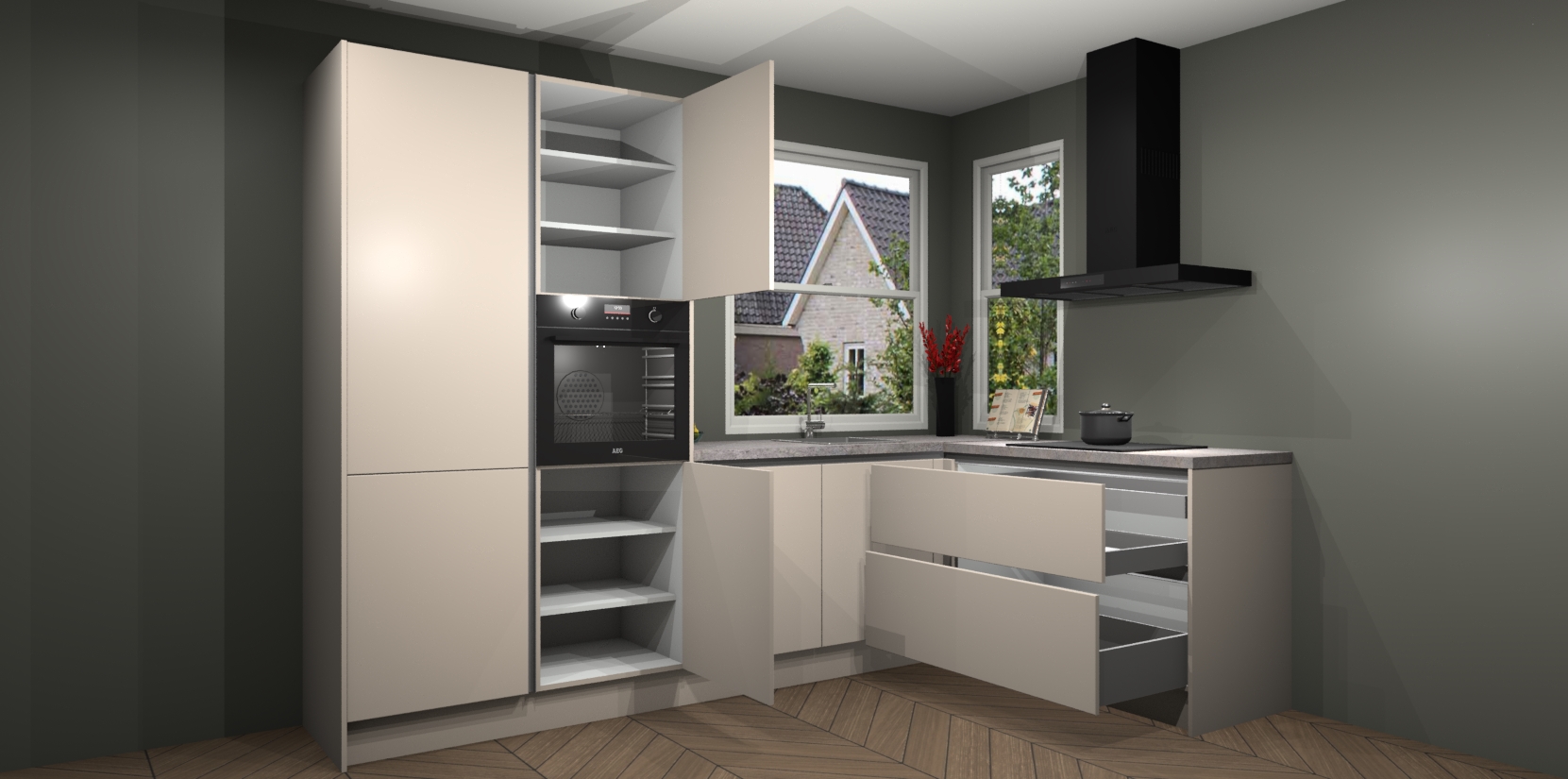 De Kasjmier greeploze keuken Kotor wordt geleverd met vijf inbouwapparaten, waaronder een oven, inductiekookplaat, afzuigkap, vaatwasser en koelkast. En als u uw apparatuur wilt upgraden, kunnen we u na bestelling eenvoudig helpen overstappen naar AEG. Bovendien heeft deze keuken soft close deuren, zodat lades en kastjes geruisloos en zonder klepperen sluiten!