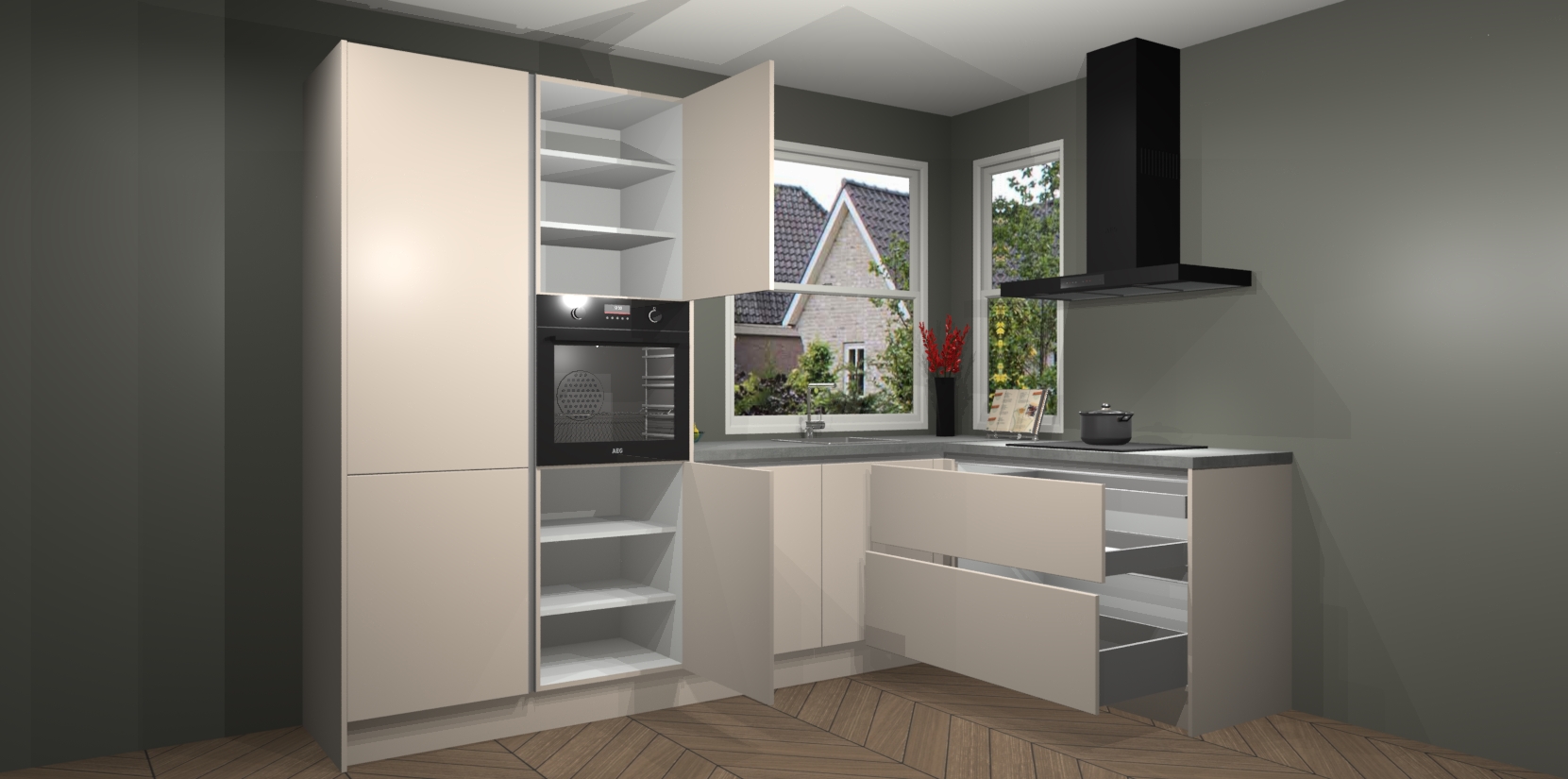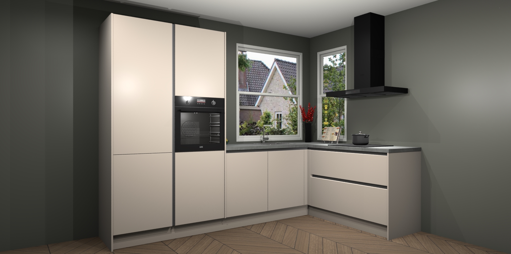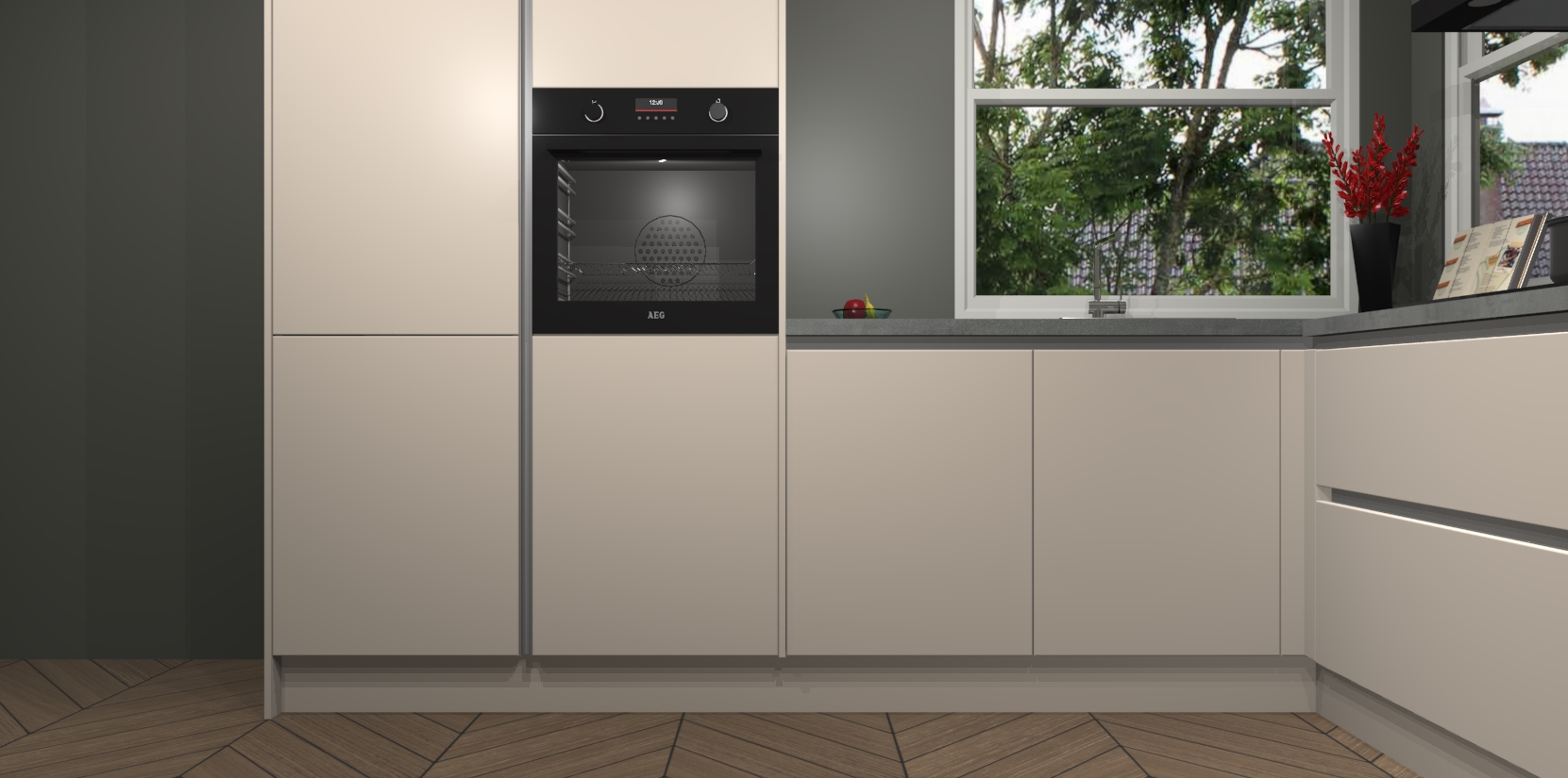 De Kasjmier greeploze keuken Kotor wordt geleverd met vijf inbouwapparaten, waaronder een oven, inductiekookplaat, afzuigkap, vaatwasser en koelkast. En als u uw apparatuur wilt upgraden, kunnen we u na bestelling eenvoudig helpen overstappen naar AEG. Bovendien heeft deze keuken soft close deuren, zodat lades en kastjes geruisloos en zonder klepperen sluiten!