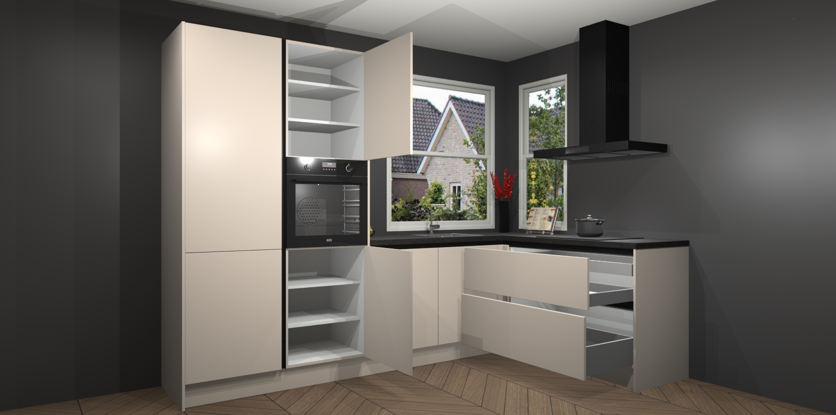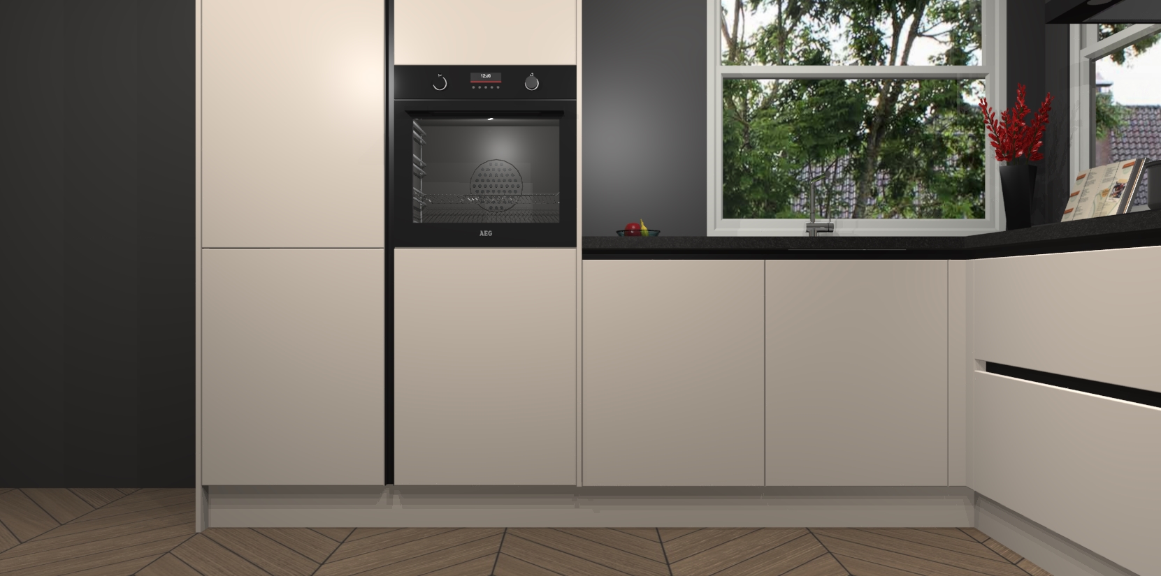 De Kasjmier greeploze keuken Kotor wordt geleverd met vijf inbouwapparaten, waaronder een oven, inductiekookplaat, afzuigkap, vaatwasser en koelkast. En als u uw apparatuur wilt upgraden, kunnen we u na bestelling eenvoudig helpen overstappen naar AEG. Bovendien heeft deze keuken soft close deuren, zodat lades en kastjes geruisloos en zonder klepperen sluiten!
