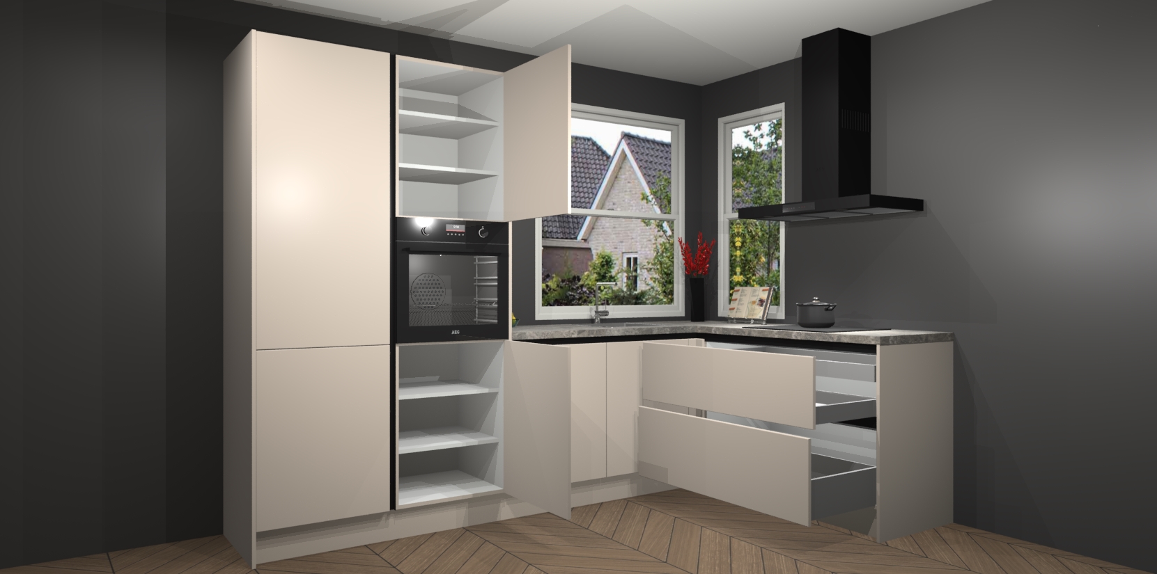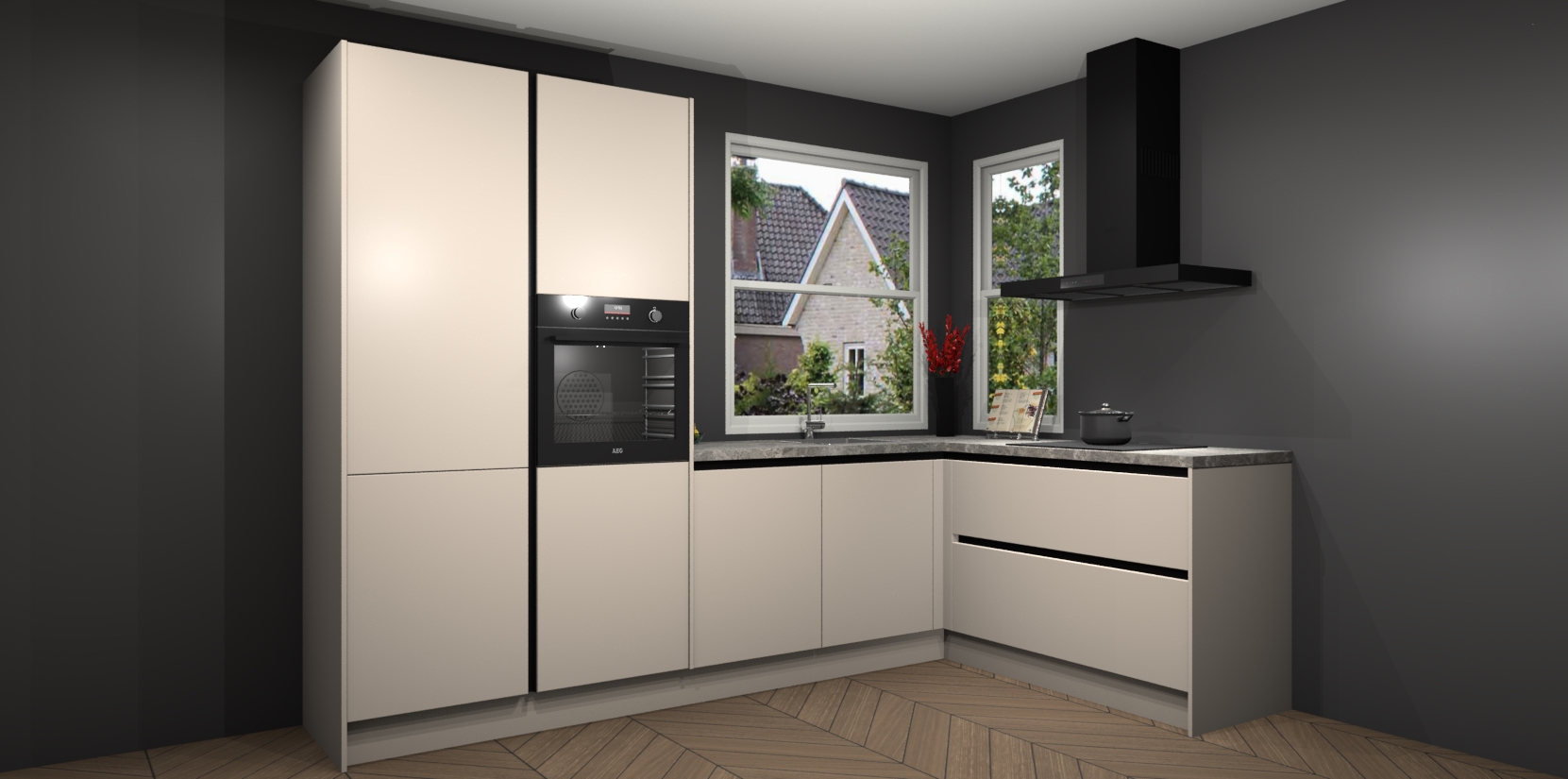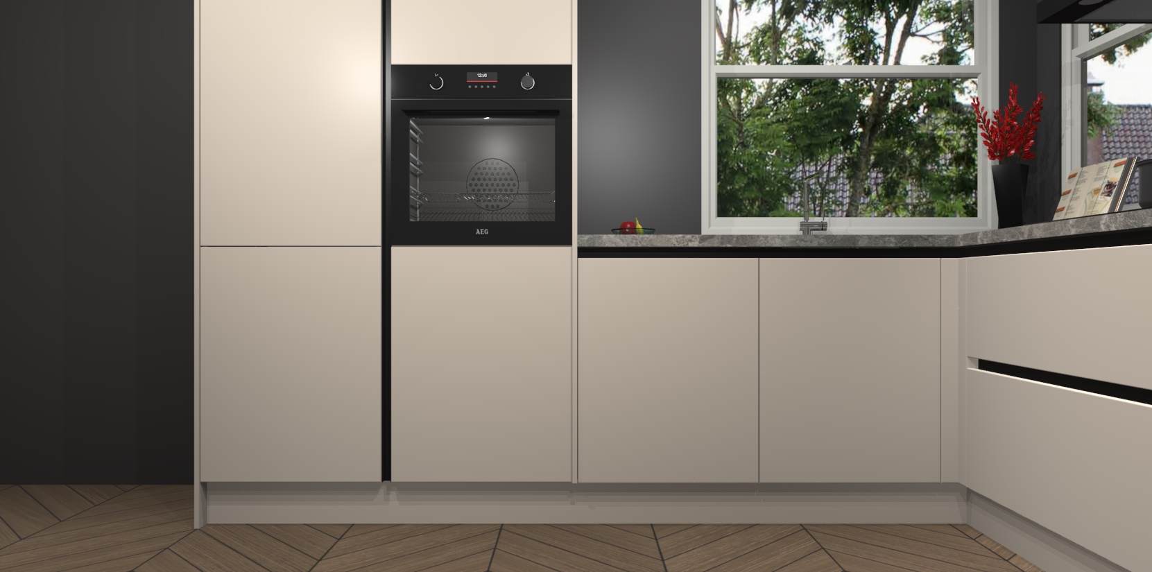 De Kasjmier greeploze keuken Kotor wordt geleverd met vijf inbouwapparaten, waaronder een oven, inductiekookplaat, afzuigkap, vaatwasser en koelkast. En als u uw apparatuur wilt upgraden, kunnen we u na bestelling eenvoudig helpen overstappen naar AEG. Bovendien heeft deze keuken soft close deuren, zodat lades en kastjes geruisloos en zonder klepperen sluiten!