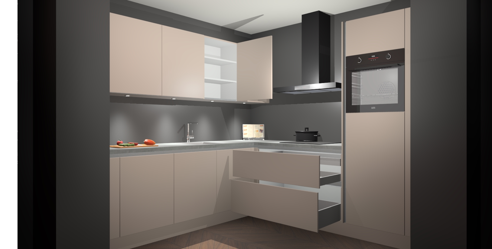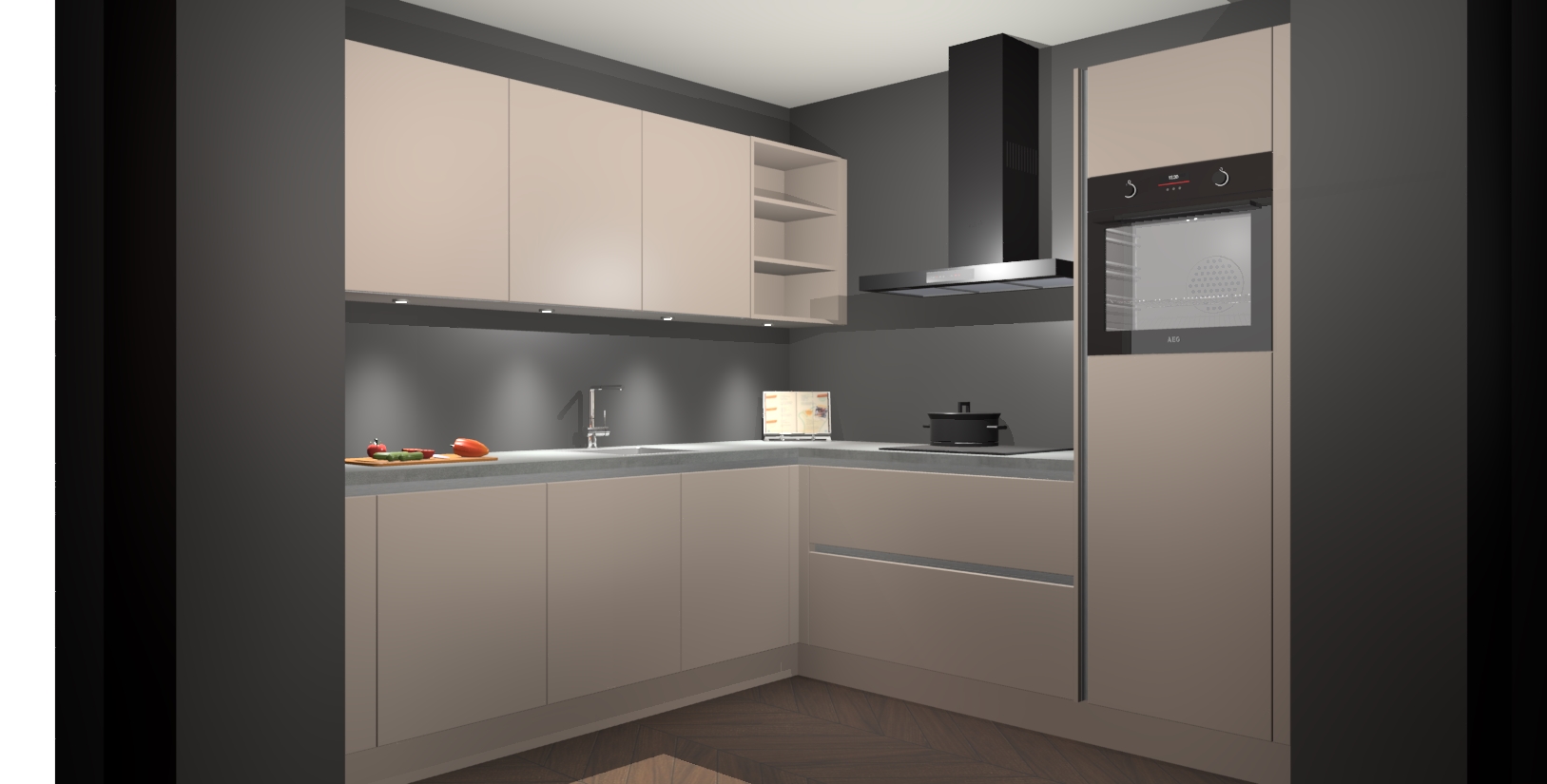 Met een modern, tijdloos design en ruime opslagruimte, zult u zich in no-time thuis voelen in uw nieuwe keuken. Uw leven wordt eenvoudiger met de soft-close deuren die voor het ultieme stille comfort zorgen - geen geluid dat u stoort terwijl u kookt. Ook is de keuken voorzien van 5 ingebouwde apparaten: een oven, inductie kookplaat, afzuigkap, vaatwasser en koelkast. Deze kunnen gemakkelijk na bestelling worden bijgewerkt naar AEG - waardoor uw luxe ervaring compleet is.