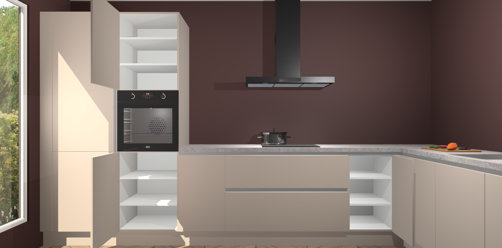 Met een modern, tijdloos design en ruime opslagruimte, zult u zich in no-time thuis voelen in uw nieuwe keuken. Uw leven wordt eenvoudiger met de soft-close deuren die voor het ultieme stille comfort zorgen - geen geluid dat u stoort terwijl u kookt. Ook is de keuken voorzien van 5 ingebouwde apparaten: een oven, inductie kookplaat, afzuigkap, vaatwasser en koelkast. Deze kunnen gemakkelijk na bestelling worden bijgewerkt naar AEG - waardoor uw luxe ervaring compleet is.