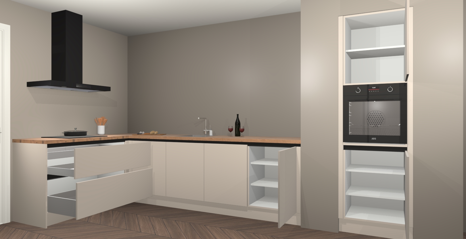 De Kasjmier greeploze keuken Onslow wordt geleverd met vijf inbouwapparaten, waaronder een oven, inductiekookplaat, afzuigkap, vaatwasser en koelkast. En als u uw apparatuur wilt upgraden, kunnen we u na bestelling eenvoudig helpen overstappen naar AEG. Bovendien heeft deze keuken soft close deuren, zodat lades en kastjes geruisloos en zonder klepperen sluiten!