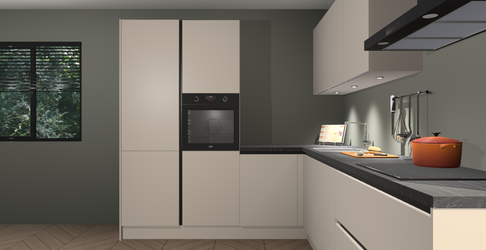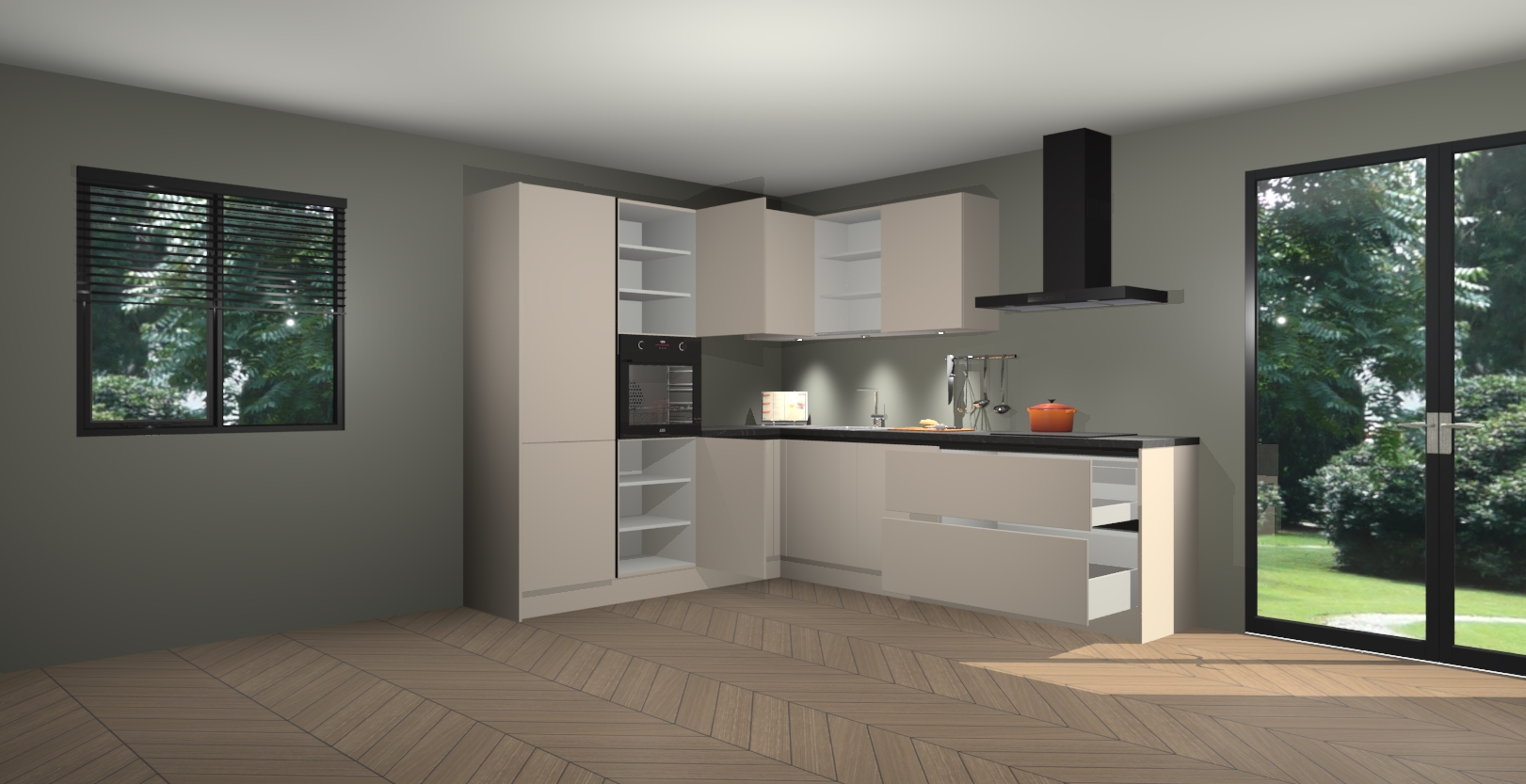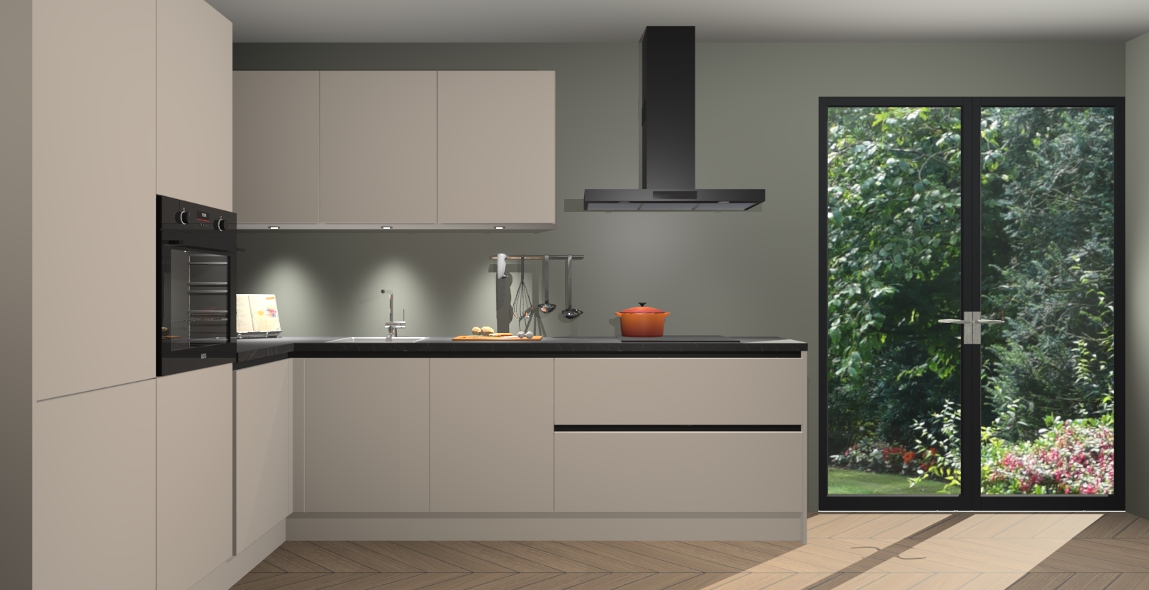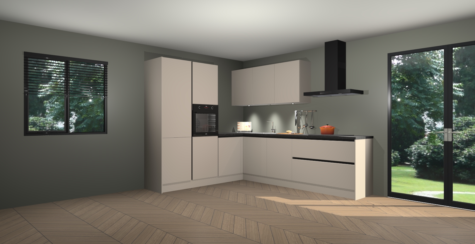 Maak kennis met de kasjmier greeploze keuken Parla - de perfecte aanvulling voor uw moderne keuken! Ervaar tijdloos design, elegantie en een chique uitstraling met onze zwarte handgrepen, soft-close deuren en veel opbergruimte. Dit alles wordt aangeboden tegen een vaste lage prijs voor ongeëvenaarde Duitse keukenkwaliteit!