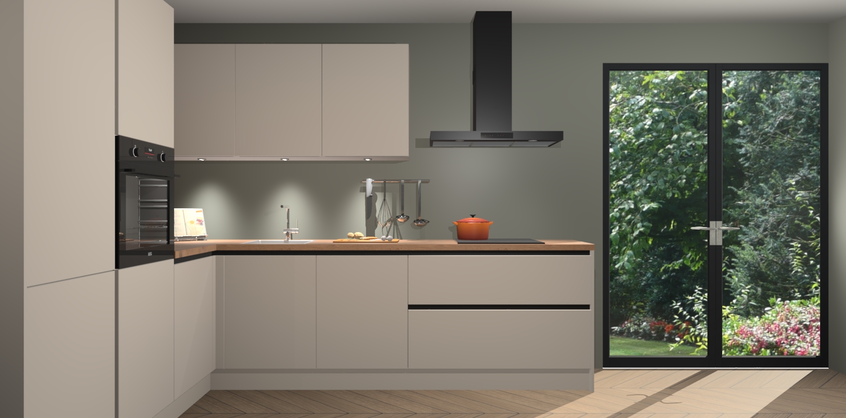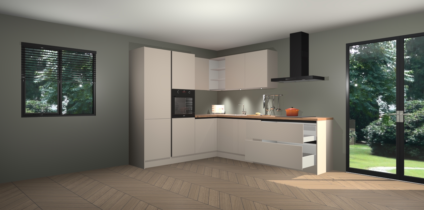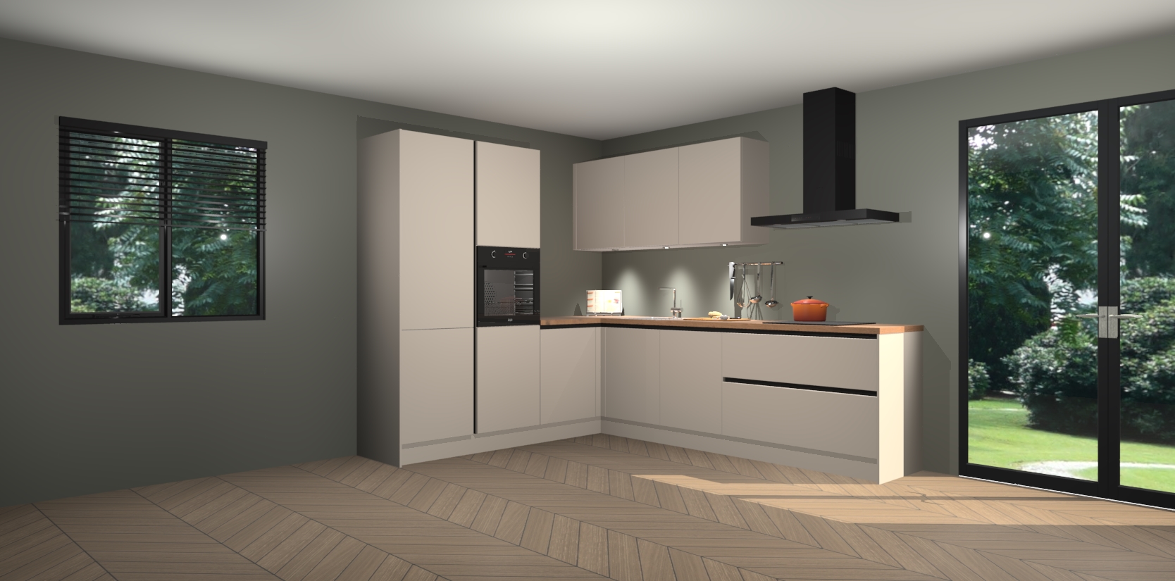 Maak kennis met de kasjmier greeploze keuken Parla - de perfecte aanvulling voor uw moderne keuken! Ervaar tijdloos design, elegantie en een chique uitstraling met onze zwarte handgrepen, soft-close deuren en veel opbergruimte. Dit alles wordt aangeboden tegen een vaste lage prijs voor ongeëvenaarde Duitse keukenkwaliteit!