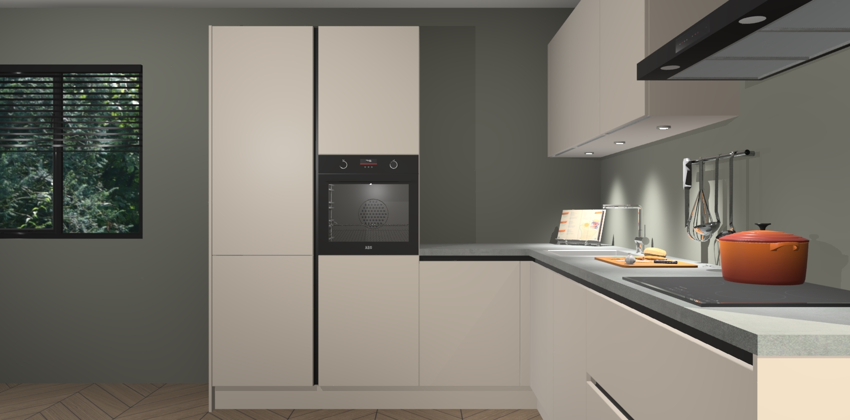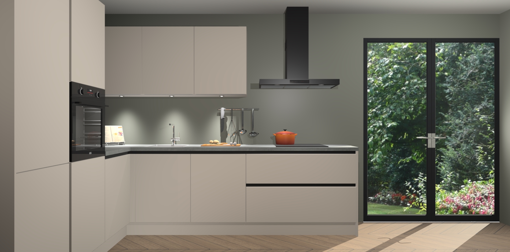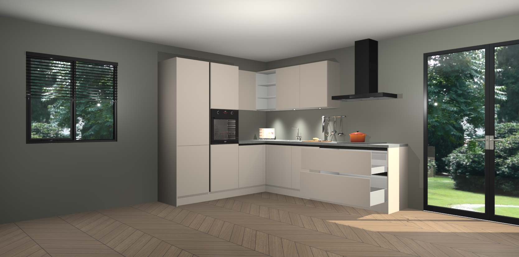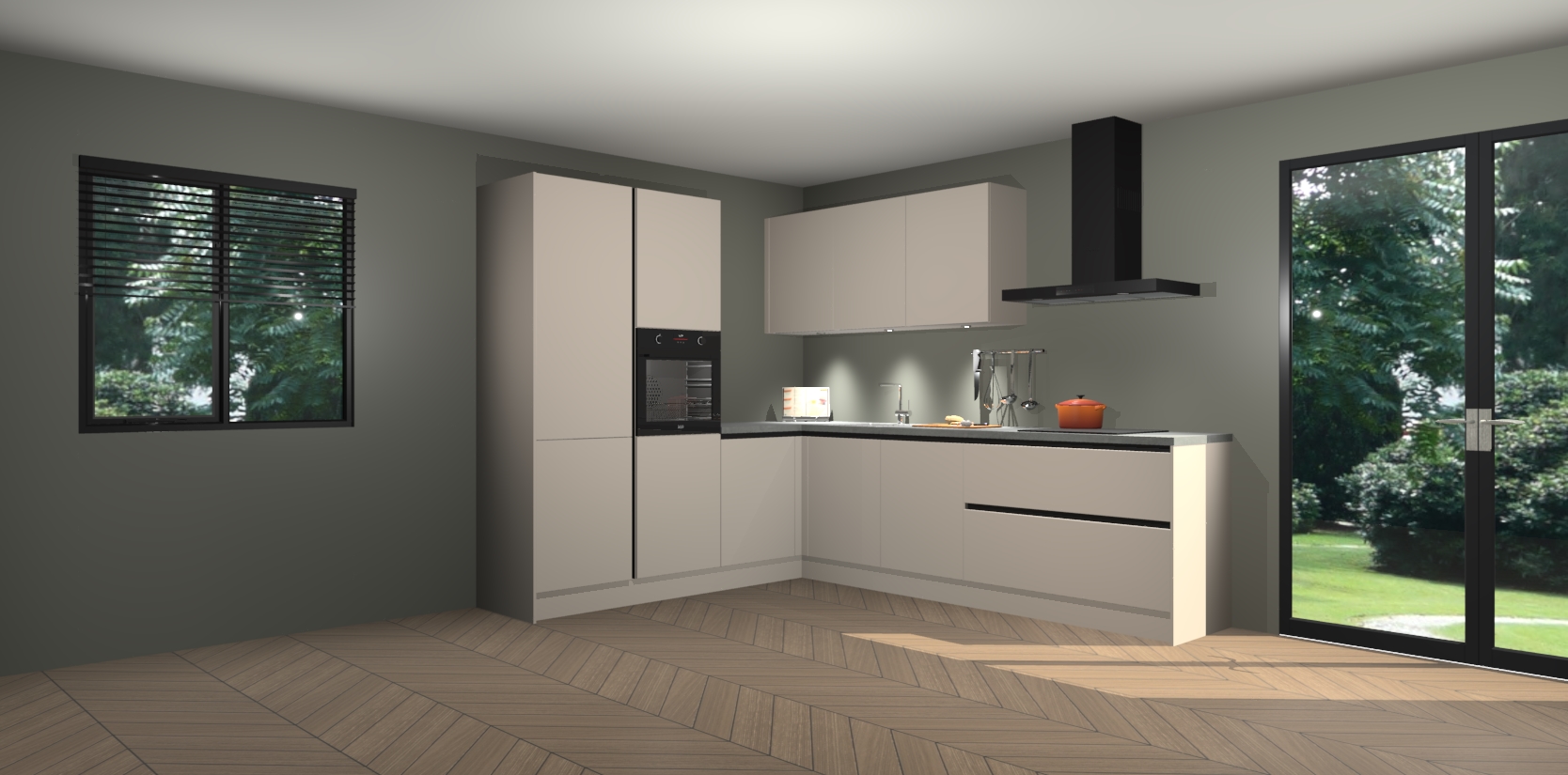 Maak kennis met de kasjmier greeploze keuken Parla - de perfecte aanvulling voor uw moderne keuken! Ervaar tijdloos design, elegantie en een chique uitstraling met onze zwarte handgrepen, soft-close deuren en veel opbergruimte. Dit alles wordt aangeboden tegen een vaste lage prijs voor ongeëvenaarde Duitse keukenkwaliteit!