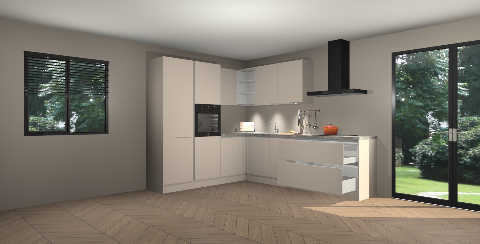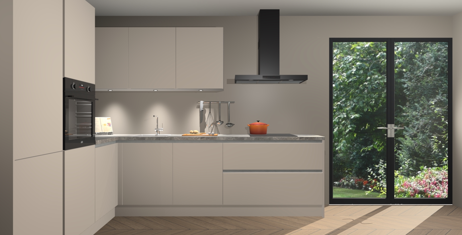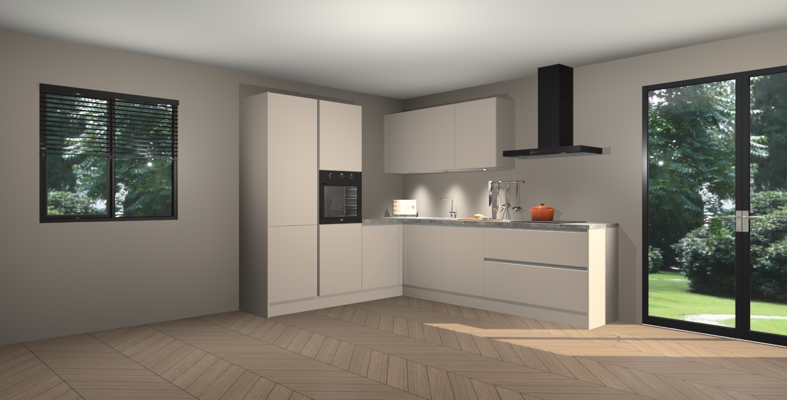 Maak kennis met de kasjmier greeploze keuken Parla - de perfecte aanvulling voor uw moderne keuken! Ervaar tijdloos design, elegantie en een chique uitstraling met onze zwarte handgrepen, soft-close deuren en veel opbergruimte. Dit alles wordt aangeboden tegen een vaste lage prijs voor ongeëvenaarde Duitse keukenkwaliteit!