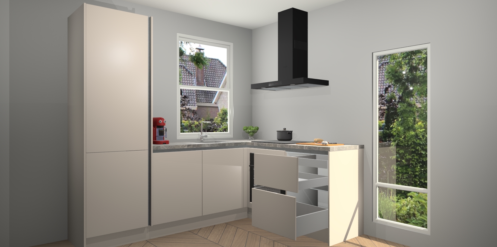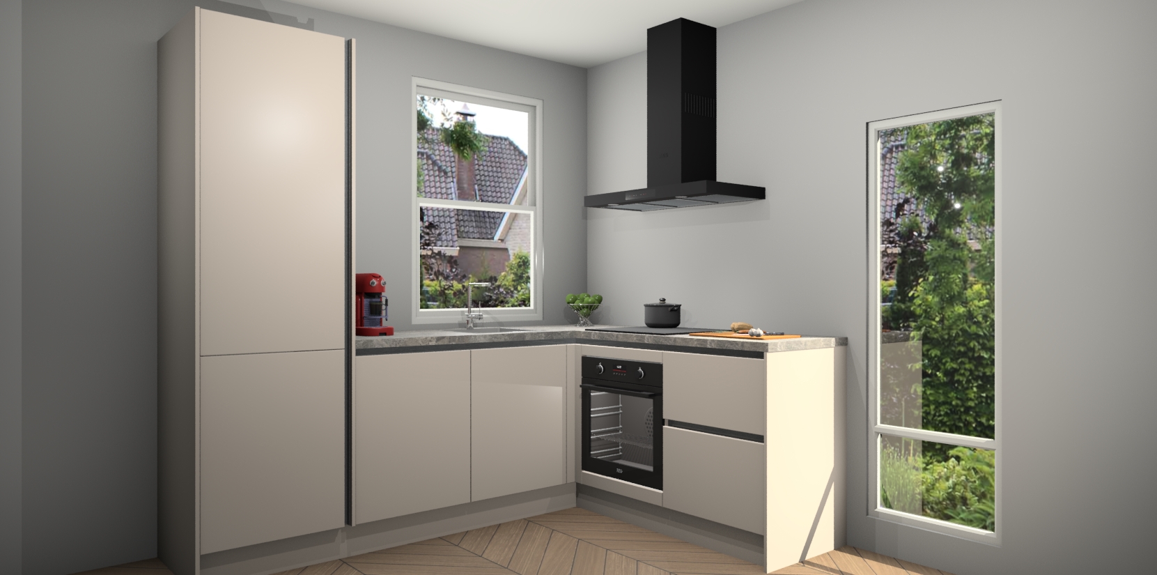 De prachtige Kasjmier greeploze keuken Phuket is de perfecte keuze als u op zoek bent naar een moderne hoekkeuken met alle luxe en comfort die u kunt verwachten! De uitstraling in het houtlook-design draagt bij aan de warme sfeer die u nu al voelt wanneer u er naar kijkt. Heeft u genoeg van ouderwetse keukens? Probeer dan direct deze moderne, mooie hoekkeukens en laat iedereen verbluft achter!
