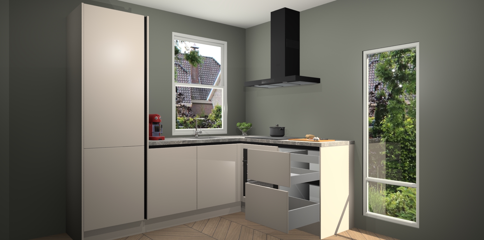 De prachtige Kasjmier greeploze keuken Phuket is de perfecte keuze als u op zoek bent naar een moderne hoekkeuken met alle luxe en comfort die u kunt verwachten! De uitstraling in het houtlook-design draagt bij aan de warme sfeer die u nu al voelt wanneer u er naar kijkt. Heeft u genoeg van ouderwetse keukens? Probeer dan direct deze moderne, mooie hoekkeukens en laat iedereen verbluft achter!