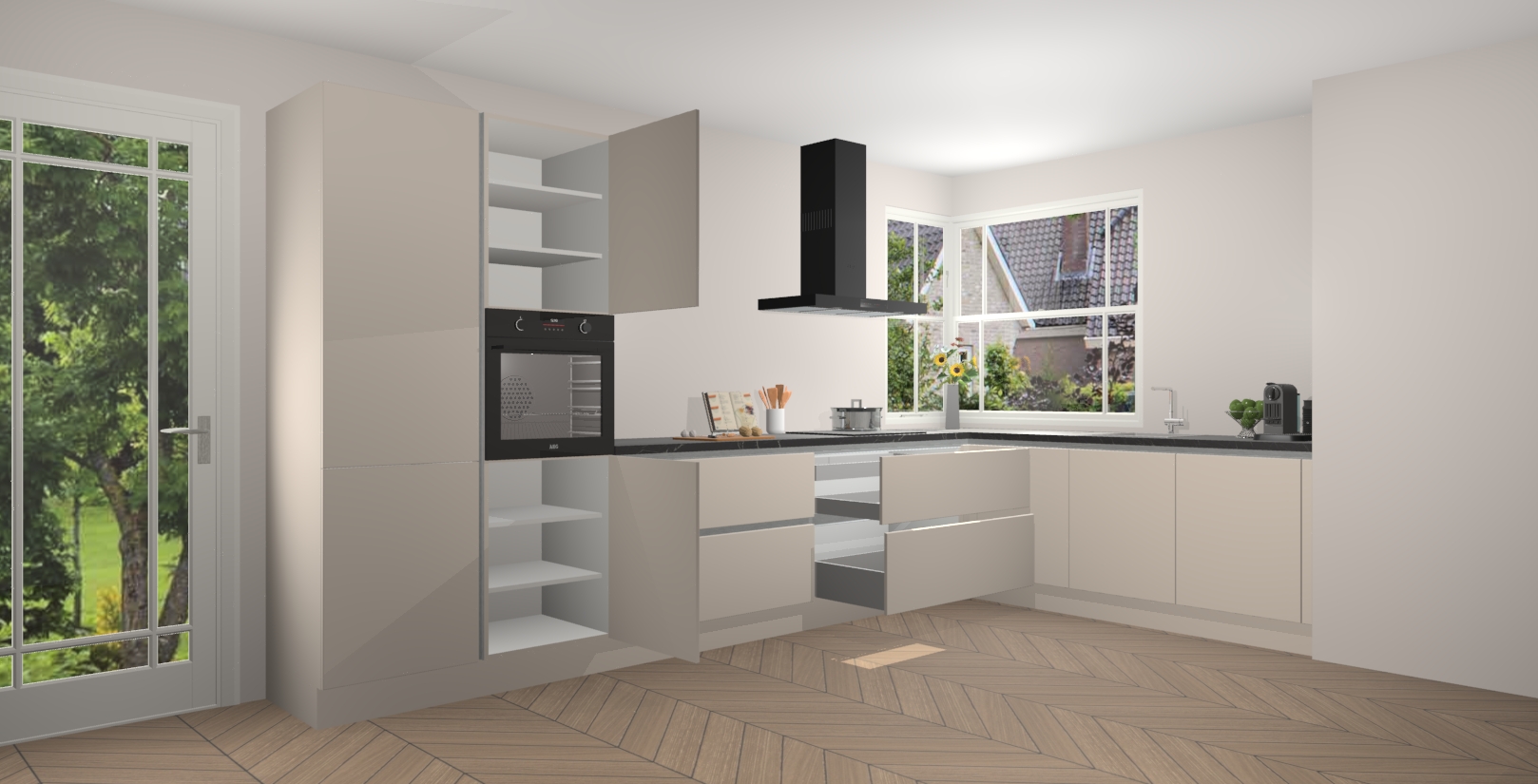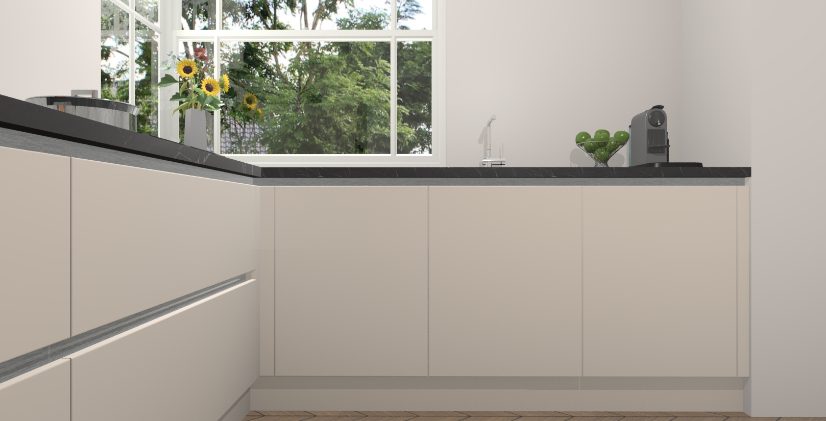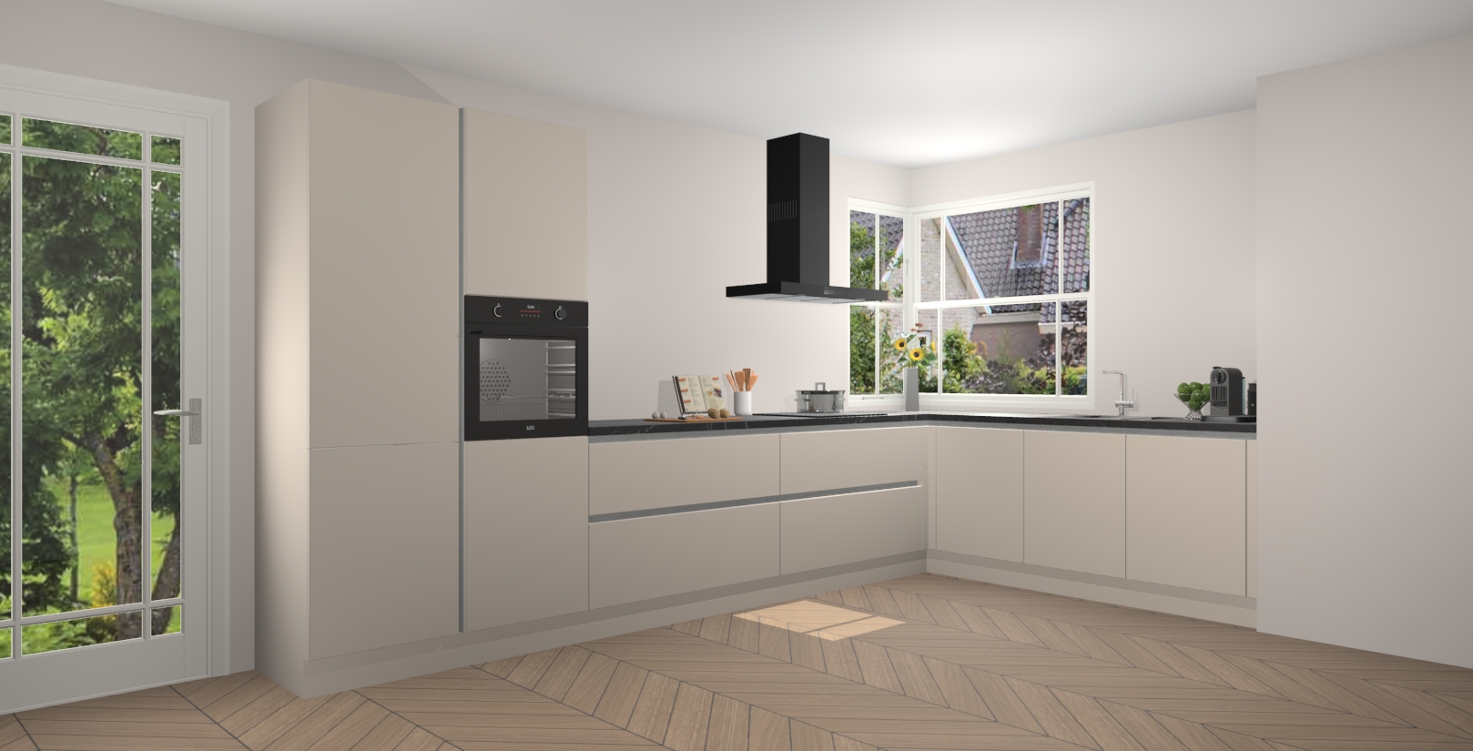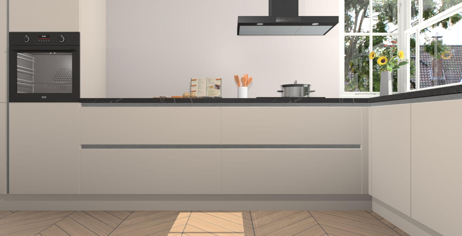Welkom bij de Kasjmier greeploze keuken Praia. Deze prachtige keuken zal de komende jaren het middelpunt van de belangstelling in uw huis zijn. Uitgerust met vijf inbouwapparaten komt u nooit kookgereedschap tekort. Bovendien geeft kasjmierkleur elke ruimte een uitnodigende en tijdloze uitstraling.