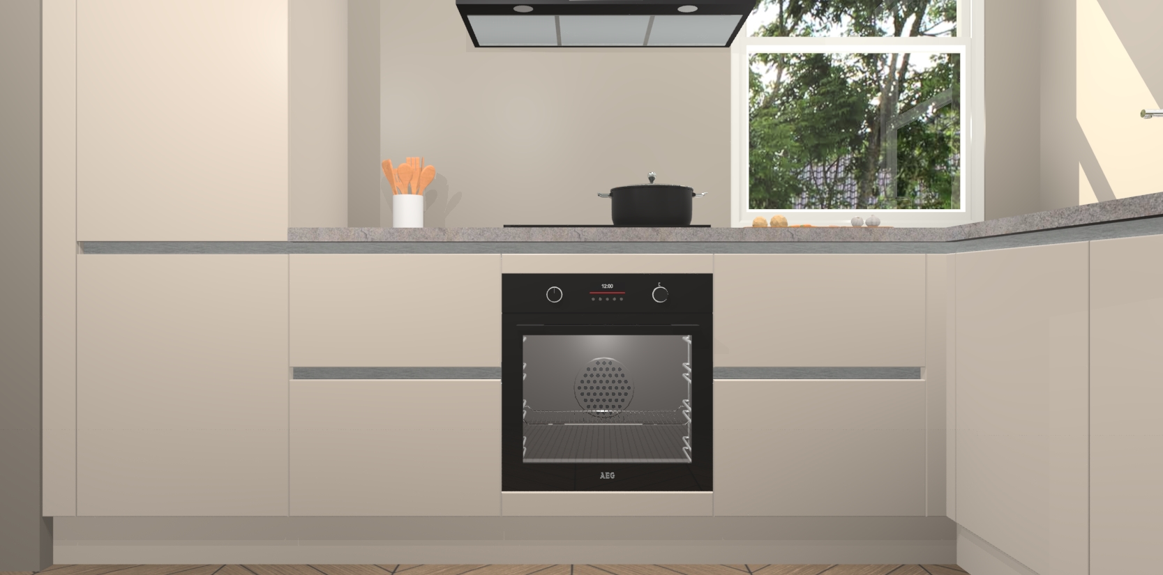 Wat maakt deze keuken zo bijzonder? Ten eerste geeft het houten werkblad uw ruimte een onmiskenbaar klassieke uitstraling. De natuurlijke afwerking roept warmte en elegantie op die nooit uit de mode zullen raken. Bovendien is het gemakkelijk schoon te houden en te onderhouden, zodat je er jarenlang plezier van kunt hebben. Als u op zoek bent naar extra gemak in uw keuken, dan heeft u bij het plaatsen van een bestelling bij ons ook de optie om uw toestellen te upgraden naar AEG-modellen - zo haalt u moderne innovatie van topmerken in apparatentechnologie rechtstreeks in huis.