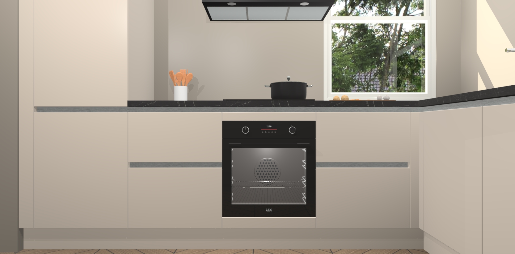 Wat maakt deze keuken zo bijzonder? Ten eerste geeft het houten werkblad uw ruimte een onmiskenbaar klassieke uitstraling. De natuurlijke afwerking roept warmte en elegantie op die nooit uit de mode zullen raken. Bovendien is het gemakkelijk schoon te houden en te onderhouden, zodat je er jarenlang plezier van kunt hebben. Als u op zoek bent naar extra gemak in uw keuken, dan heeft u bij het plaatsen van een bestelling bij ons ook de optie om uw toestellen te upgraden naar AEG-modellen - zo haalt u moderne innovatie van topmerken in apparatentechnologie rechtstreeks in huis.