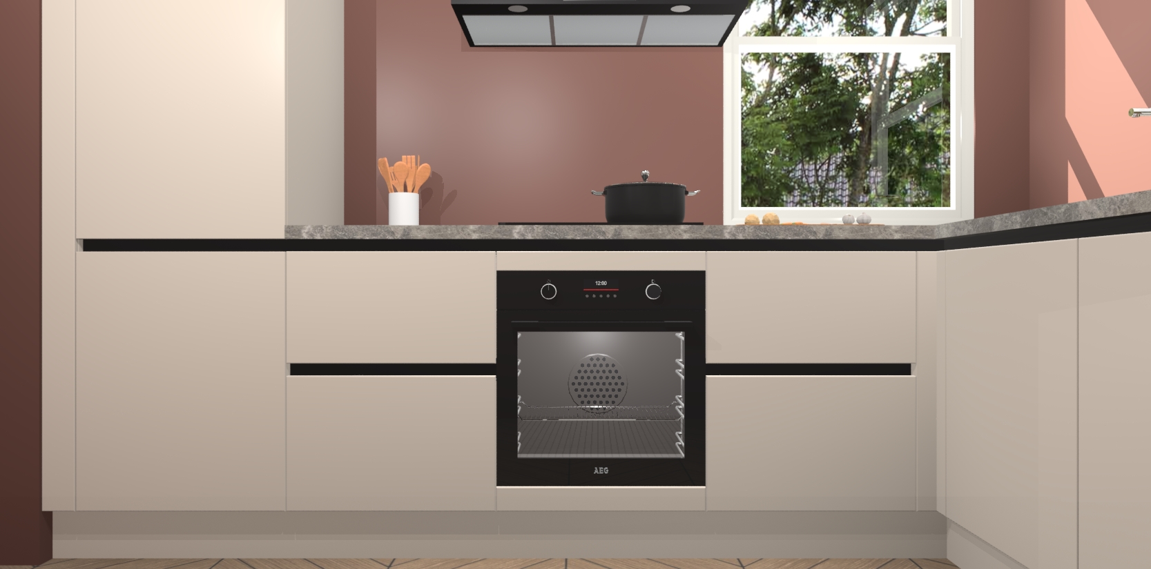 Wat maakt deze keuken zo bijzonder? Ten eerste geeft het houten werkblad uw ruimte een onmiskenbaar klassieke uitstraling. De natuurlijke afwerking roept warmte en elegantie op die nooit uit de mode zullen raken. Bovendien is het gemakkelijk schoon te houden en te onderhouden, zodat je er jarenlang plezier van kunt hebben. Als u op zoek bent naar extra gemak in uw keuken, dan heeft u bij het plaatsen van een bestelling bij ons ook de optie om uw toestellen te upgraden naar AEG-modellen - zo haalt u moderne innovatie van topmerken in apparatentechnologie rechtstreeks in huis.