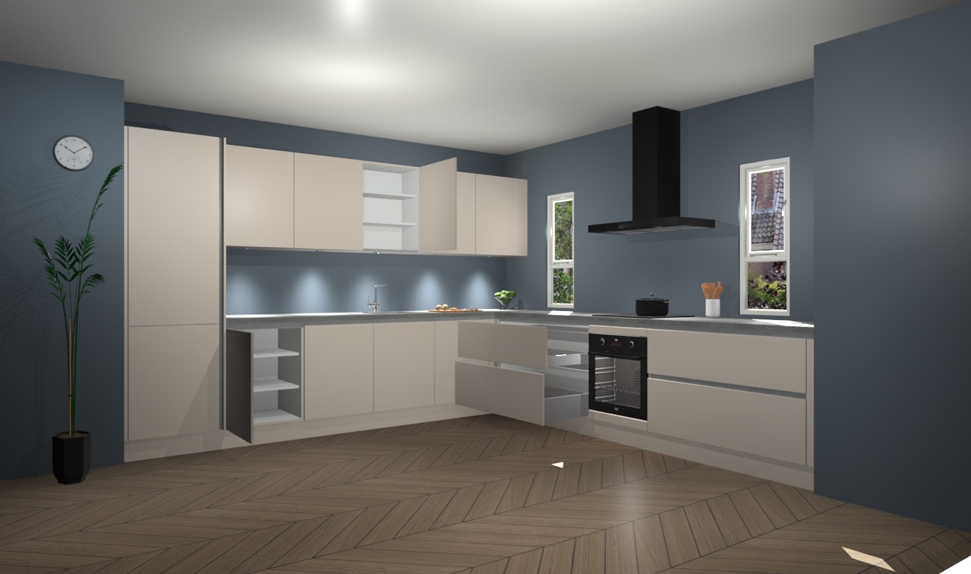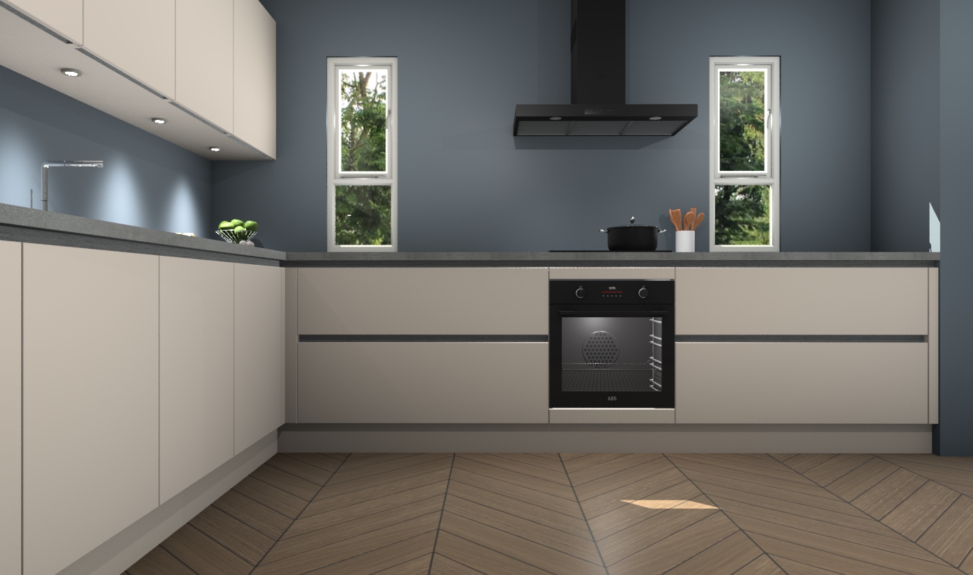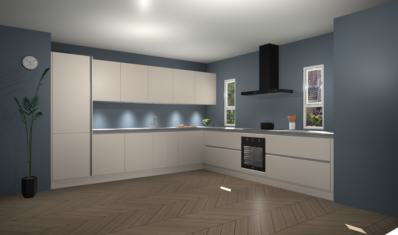 De kasjmier greeploze keuken is een ideale hoekkeuken en heeft alle functies en apparatuur die u maar nodig kunt hebben. Bij de bestelling krijgt u een oven, inductiekookplaat, afzuigkap, vaatwasser en koelkast - deze kunnen desgewenst eenvoudig worden uitgebreid naar AEG na bestellen. Elke kast wordt ook voor gemonteerd geleverd met soft close deuren die jarenlang gebruik beloven. Stelt u zich voor dat u geen gedoe heeft met vervelende montage - vanaf het moment dat u uw bestelling plaats, duurt het slechts 7 weken voor het bij u thuis geleverd wordt.