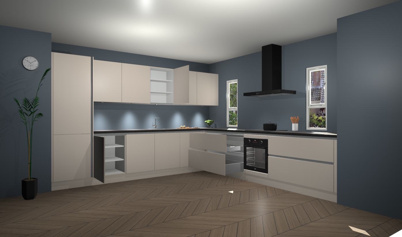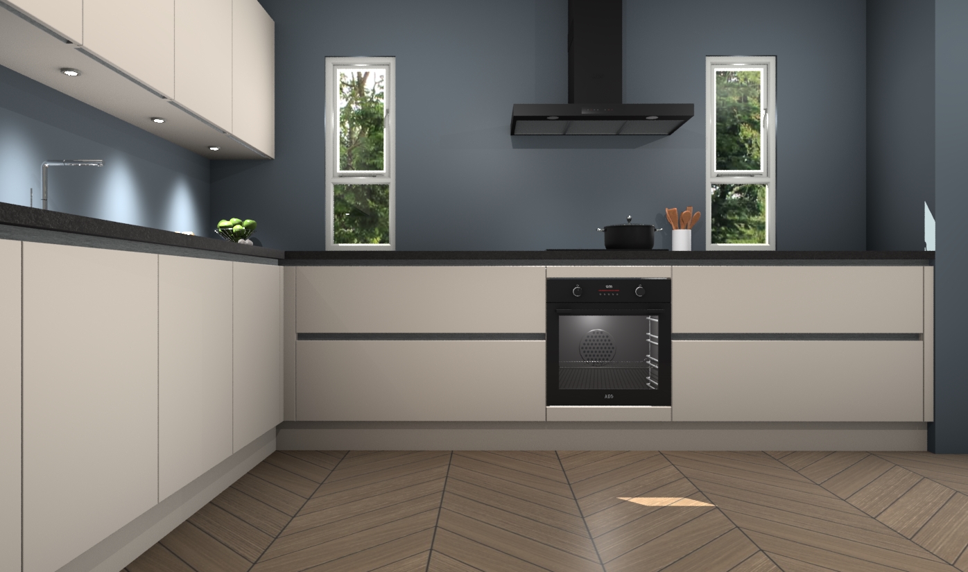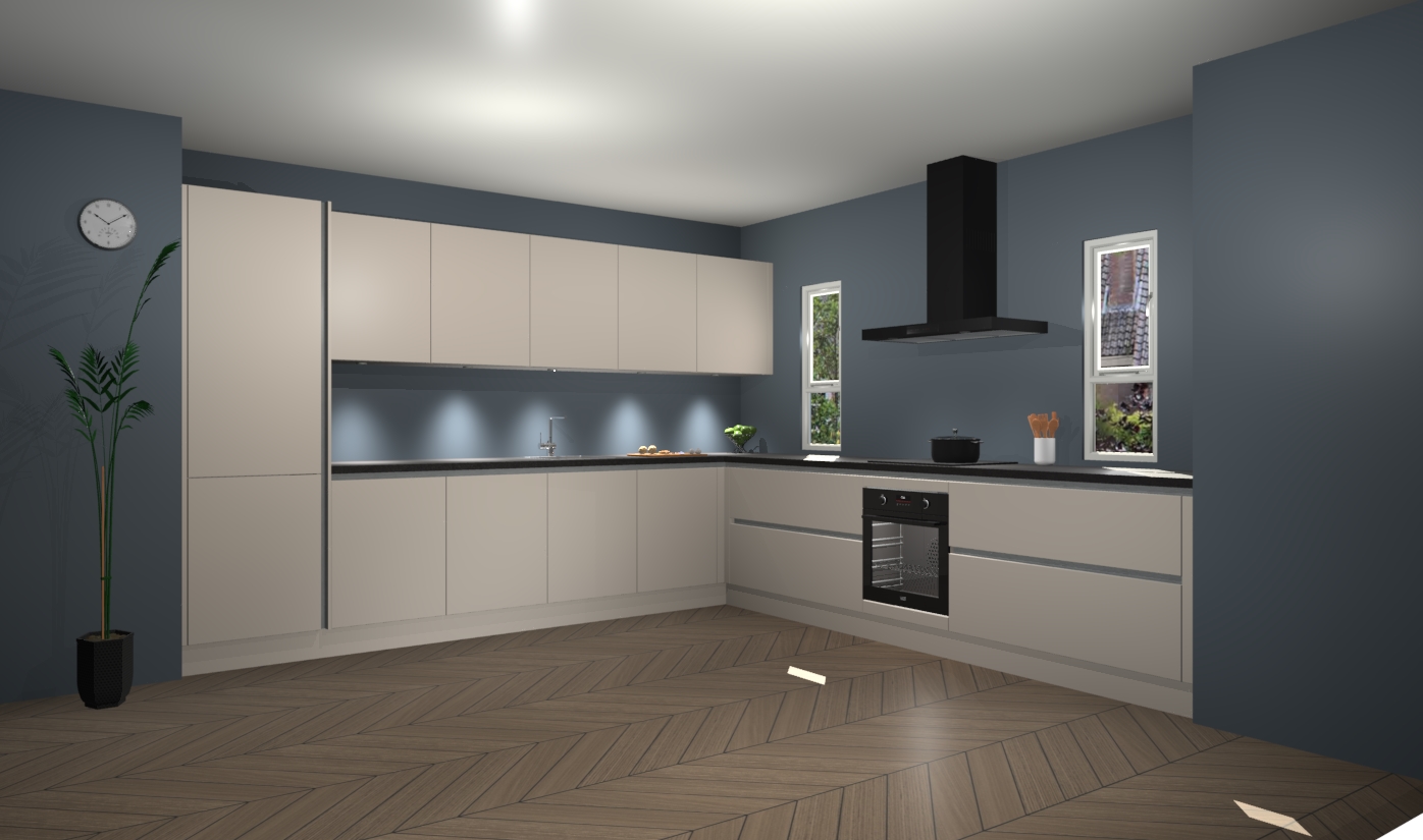 De kasjmier greeploze keuken is een ideale hoekkeuken en heeft alle functies en apparatuur die u maar nodig kunt hebben. Bij de bestelling krijgt u een oven, inductiekookplaat, afzuigkap, vaatwasser en koelkast - deze kunnen desgewenst eenvoudig worden uitgebreid naar AEG na bestellen. Elke kast wordt ook voor gemonteerd geleverd met soft close deuren die jarenlang gebruik beloven. Stelt u zich voor dat u geen gedoe heeft met vervelende montage - vanaf het moment dat u uw bestelling plaats, duurt het slechts 7 weken voor het bij u thuis geleverd wordt.