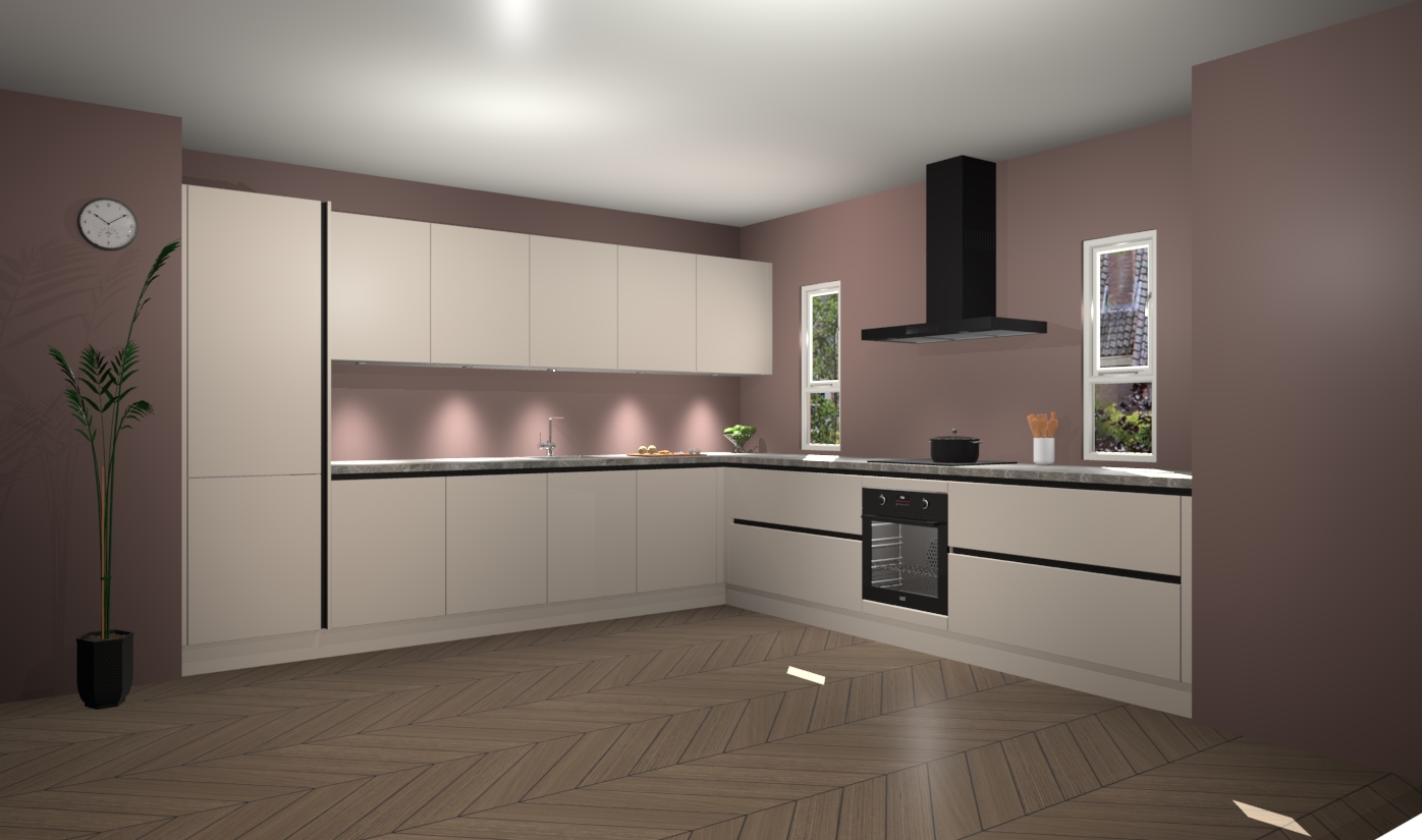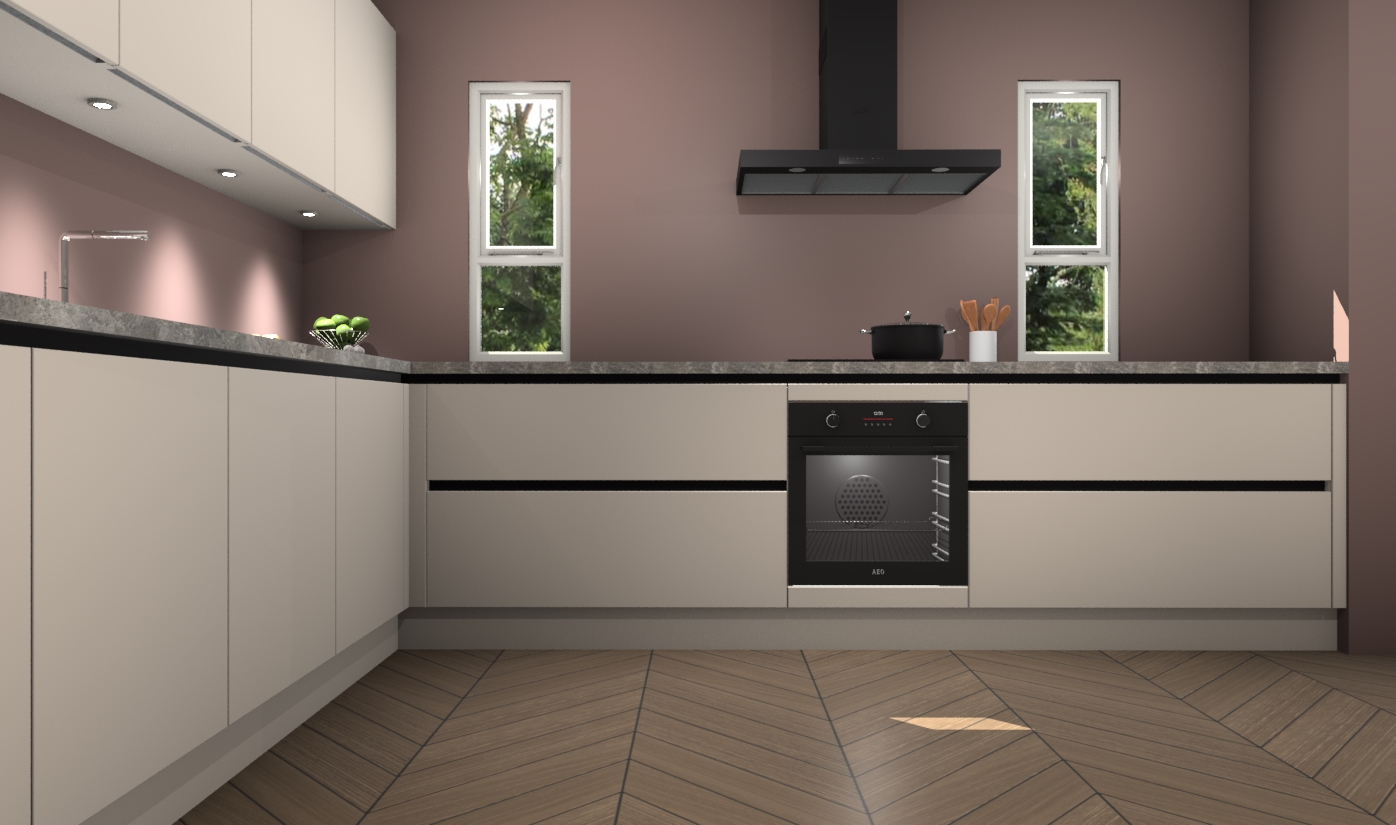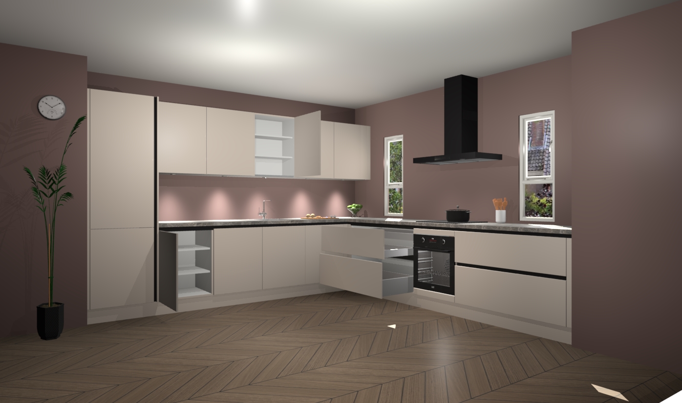 De kasjmier greeploze keuken is een ideale hoekkeuken en heeft alle functies en apparatuur die u maar nodig kunt hebben. Bij de bestelling krijgt u een oven, inductiekookplaat, afzuigkap, vaatwasser en koelkast - deze kunnen desgewenst eenvoudig worden uitgebreid naar AEG na bestellen. Elke kast wordt ook voor gemonteerd geleverd met soft close deuren die jarenlang gebruik beloven. Stelt u zich voor dat u geen gedoe heeft met vervelende montage - vanaf het moment dat u uw bestelling plaats, duurt het slechts 7 weken voor het bij u thuis geleverd wordt.