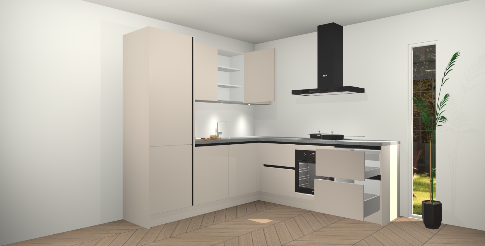 Met zijn moderne design en aantrekkelijke hoekopstelling biedt deze keuken een unieke look die zelfs de meest veeleisende huiseigenaar zal bevallen. En omdat de binnenkant van de kasten dezelfde kleur heeft als de buitenkant, heeft uw keuken een consistente afwerking. Bovenop de geweldige look is opbergruimte ook geen probleem, met voldoende kast- en laderuimte achter zelfs de mooiste buitenkant.