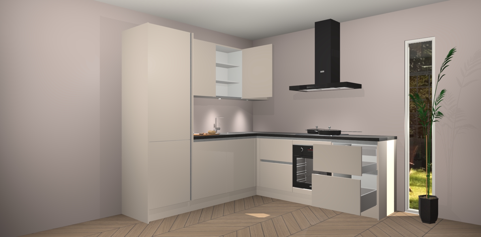 Met zijn moderne design en aantrekkelijke hoekopstelling biedt deze keuken een unieke look die zelfs de meest veeleisende huiseigenaar zal bevallen. En omdat de binnenkant van de kasten dezelfde kleur heeft als de buitenkant, heeft uw keuken een consistente afwerking. Bovenop de geweldige look is opbergruimte ook geen probleem, met voldoende kast- en laderuimte achter zelfs de mooiste buitenkant.