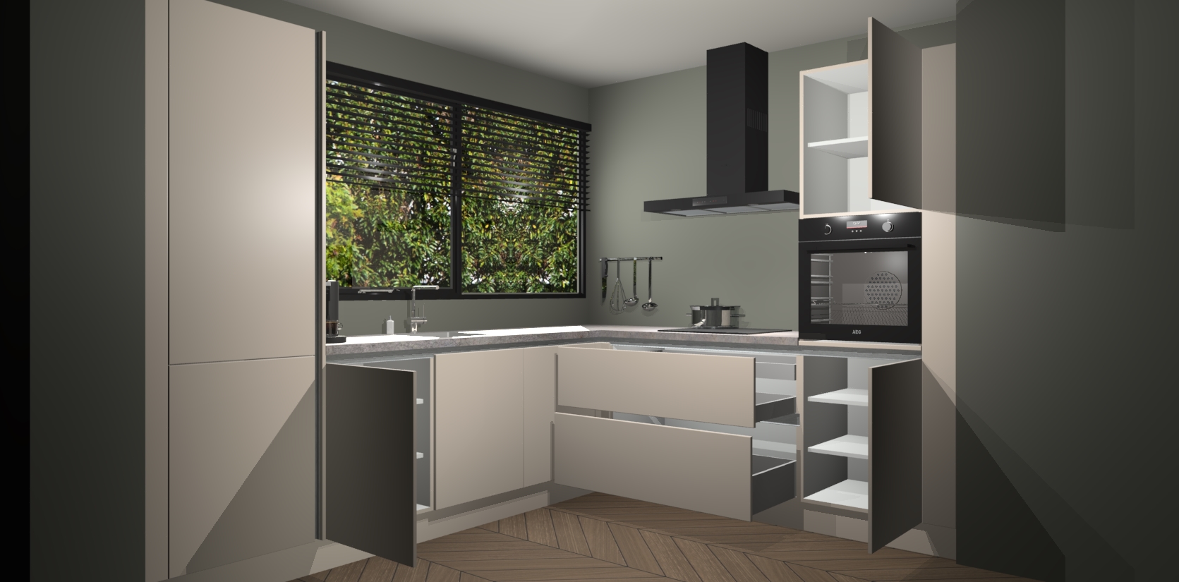 Met een modern, tijdloos design en ruime opslagruimte, zult u zich in no-time thuis voelen in uw nieuwe keuken. Uw leven wordt eenvoudiger met de soft-close deuren die voor het ultieme stille comfort zorgen - geen geluid dat u stoort terwijl u kookt. Ook is de keuken voorzien van 5 ingebouwde apparaten: een oven, inductie kookplaat, afzuigkap, vaatwasser en koelkast. Deze kunnen gemakkelijk na bestelling worden bijgewerkt naar AEG - waardoor uw luxe ervaring compleet is.