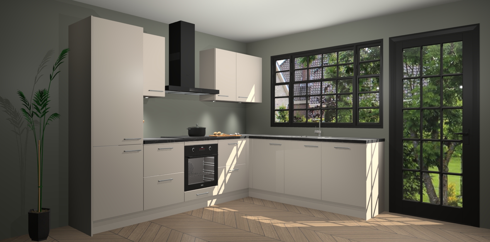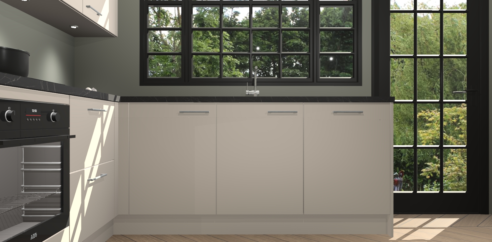 De kasjmier keuken is een ideale hoekkeuken en heeft alle functies en apparatuur die u maar nodig kunt hebben. Bij de bestelling krijgt u een oven, inductiekookplaat, afzuigkap, vaatwasser en koelkast - deze kunnen desgewenst eenvoudig worden uitgebreid naar AEG na bestellen. Elke kast wordt ook voor gemonteerd geleverd met soft close deuren die jarenlang gebruik beloven. Stelt u zich voor dat u geen gedoe heeft met vervelende montage - vanaf het moment dat u uw bestelling plaats, duurt het slechts 7 weken voor het bij u thuis geleverd wordt.