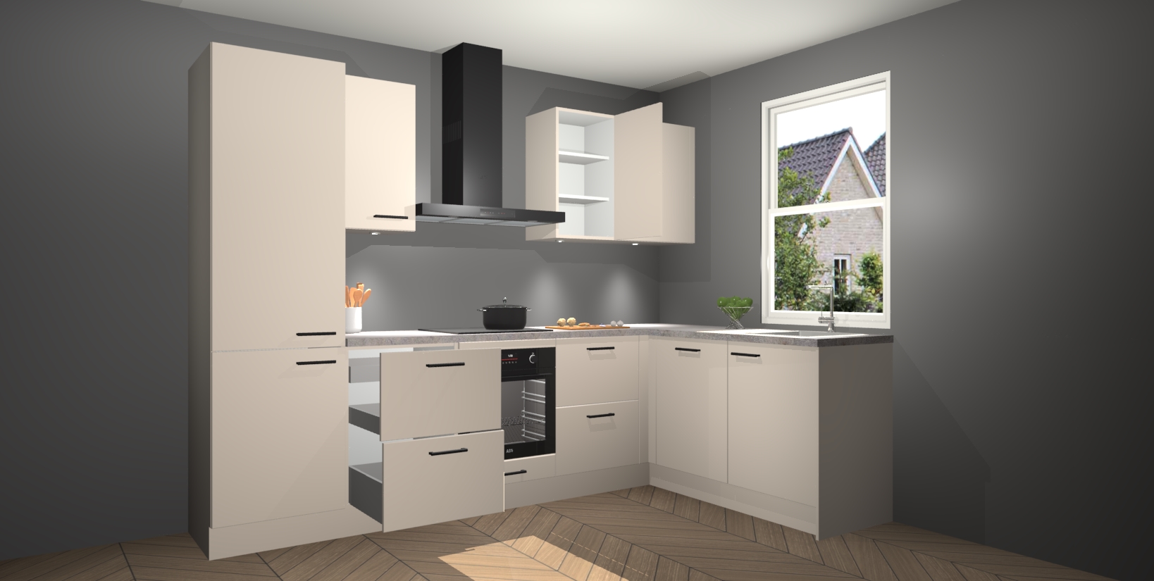 Maak kennis met de trendsettende en luxe Kasjmier keuken Bazel! Deze uitzonderlijke keuken van Duitse kwaliteit is stijlvol, modern en perfect om elk huis mee op te fleuren. De binnenkant van de kasten worden meegenomen in een bijpassende kleur om een samenhangende eigentijdse esthetiek te voltooien. U zult dol zijn op hoe uw pas gerenoveerde keuken eruitziet met de Kasjmier editie!