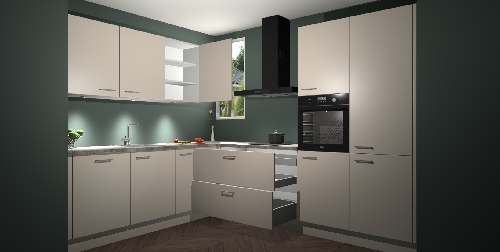 De ruime opbergruimte van dit model maakt het bereiden van voedsel en het gebruik van apparaten snel en gemakkelijk. Het beste van alles is dat het wordt geleverd met vijf inbouwapparaten: een oven, inductiekookplaat, afzuigkap, vaatwasser en koelkast - die allemaal gemakkelijk kunnen worden opgewaardeerd naar AEG na aankoop. Wat de gemaksfactor nog groter maakt, is het feit dat alle cabines voorgemonteerd worden geleverd, zodat u er meteen mee aan de slag kunt!