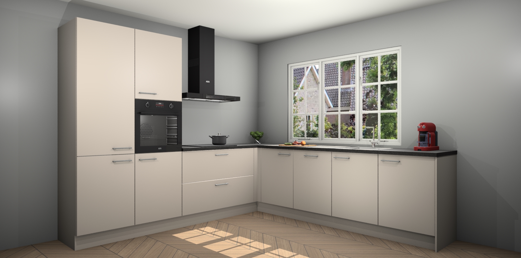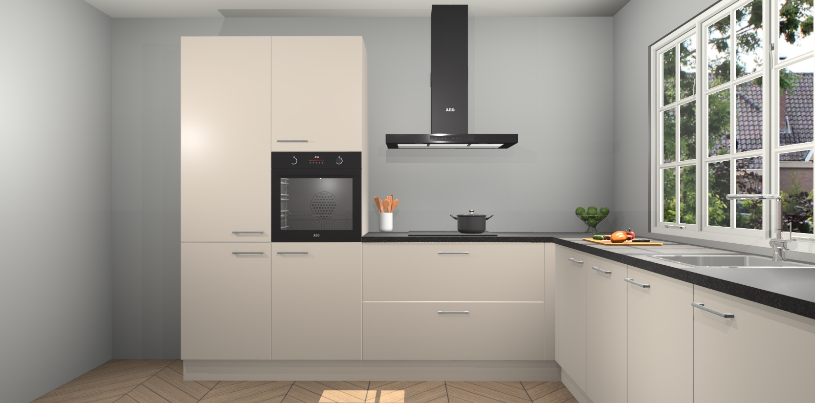 De keuken heeft veel opbergruimte, waardoor u alle ingrediënten gemakkelijk bereikbaar hebt staan. En daarnaast bevat deze volledig uitgeruste keuken ook 5 ingebouwde apparaten: een oven, inductiekookplaat, afzuigkap, vaatwasser en koelkast. Deze zijn heel eenvoudig na bestellen te upgraden naar AEG als u dit wilt. Bovendien zijn de softclose-kastdeuren ideaal; geef ze gewoon even een tikje en ze sluiten automatisch met geruisloze precisie.