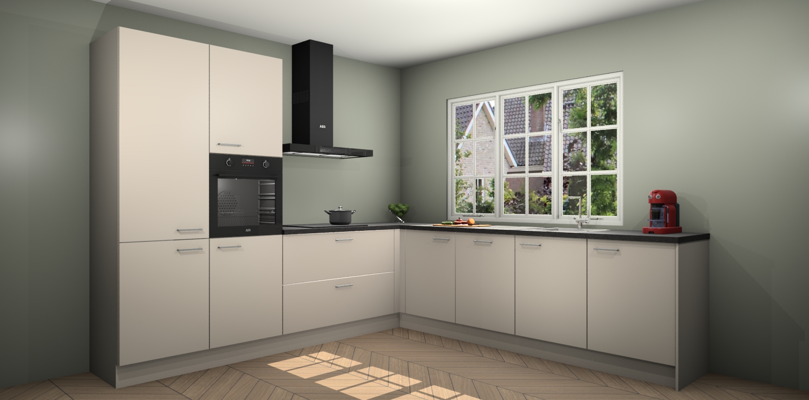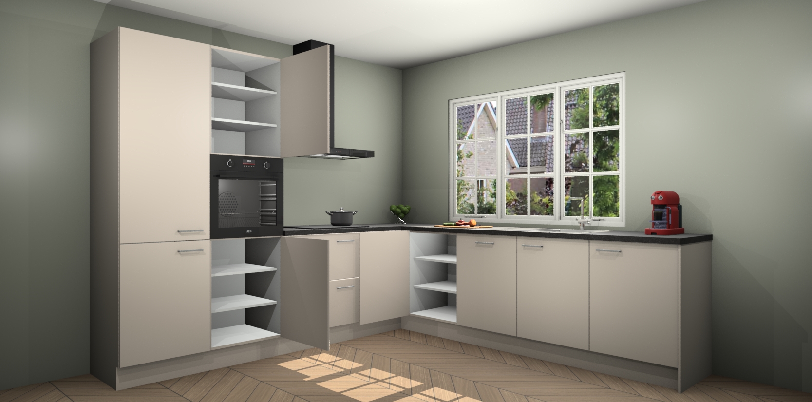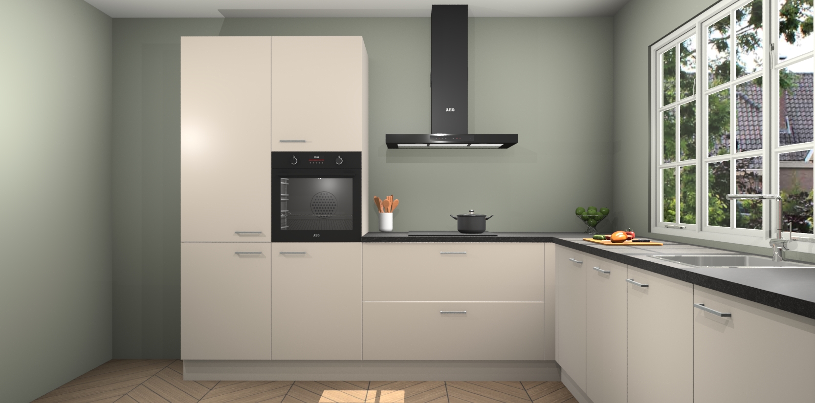 De keuken heeft veel opbergruimte, waardoor u alle ingrediënten gemakkelijk bereikbaar hebt staan. En daarnaast bevat deze volledig uitgeruste keuken ook 5 ingebouwde apparaten: een oven, inductiekookplaat, afzuigkap, vaatwasser en koelkast. Deze zijn heel eenvoudig na bestellen te upgraden naar AEG als u dit wilt. Bovendien zijn de softclose-kastdeuren ideaal; geef ze gewoon even een tikje en ze sluiten automatisch met geruisloze precisie.