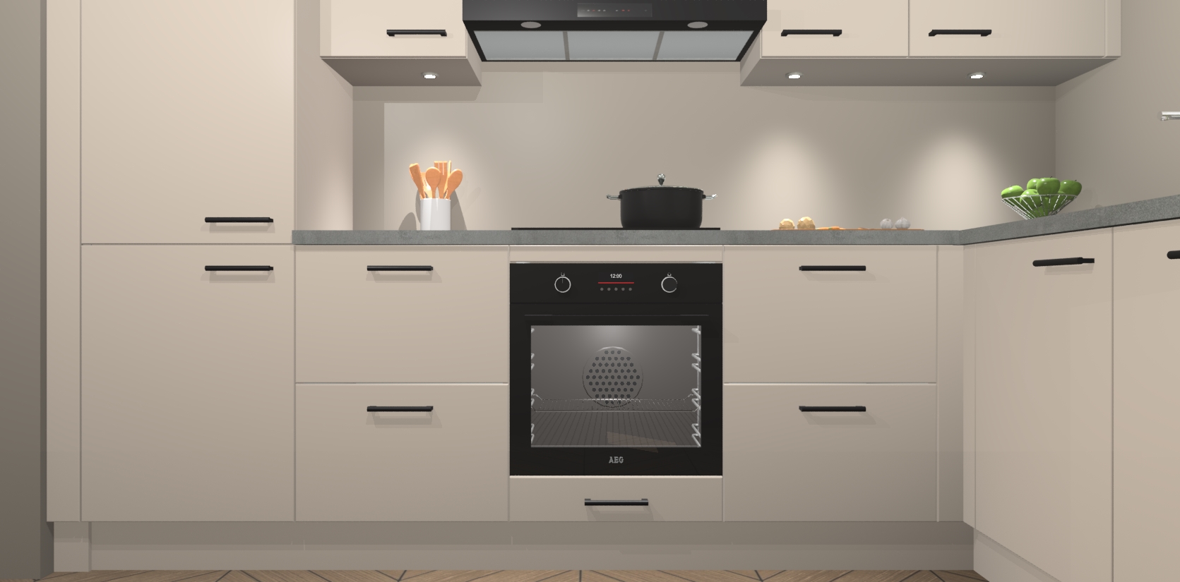 De kasjmier keuken Geneve is uitgerust met 5 inbouwapparaten - een oven, inductiekookplaat, afzuigkap, vaatwasser en koelkast - voor al uw kook- en bewaarbehoeftes. U kunt deze apparaten desgewenst eenvoudig upgraden naar AEG of de oven omruilen voor een combimagnetron na het plaatsen van uw bestelling. En met de soft close deuren, voldoende opbergruimte en kasten die voorgemonteerd worden geleverd, bent u in een mum van tijd klaar om heerlijke maaltijden te bereiden!
