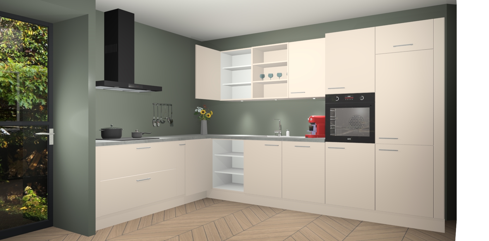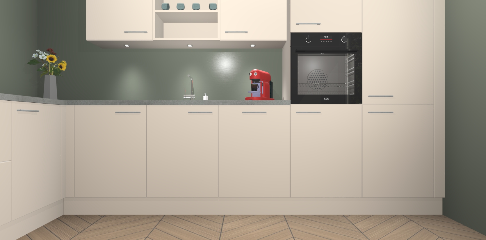 De Kasjmier keuken Gotenburg is zo ontworpen dat u alle mogelijke vormen van opslagruimte kunt genieten. Bovendien heeft u meteen toegang tot vijf ingebouwde apparaten: een oven, inductiekookplaat, afzuigkap, vaatwasser en koelkast. Gewoon upgraden naar AEG na bestelling? Dit kan heel gemakkelijk worden geregeld. De deuren sluiten zacht dankzij zachtsluitende scharnieren en ze houden warmte vast terwijl ze uitzonderlijk stil blijven wanneer ze worden geopend of gesloten.