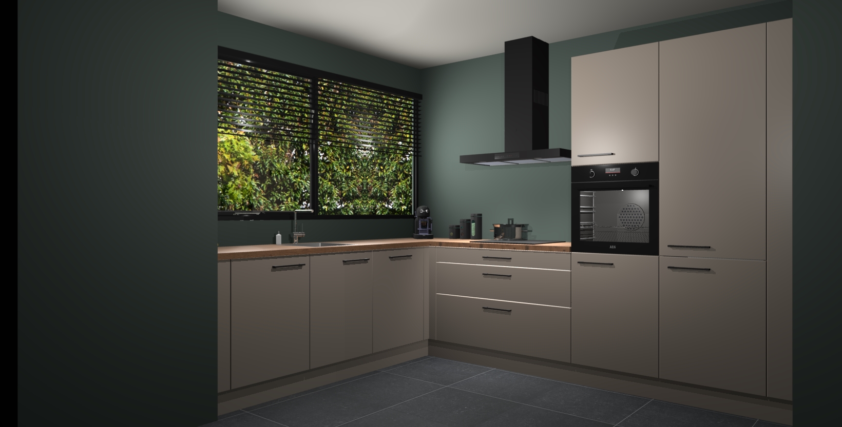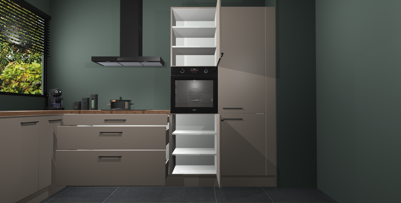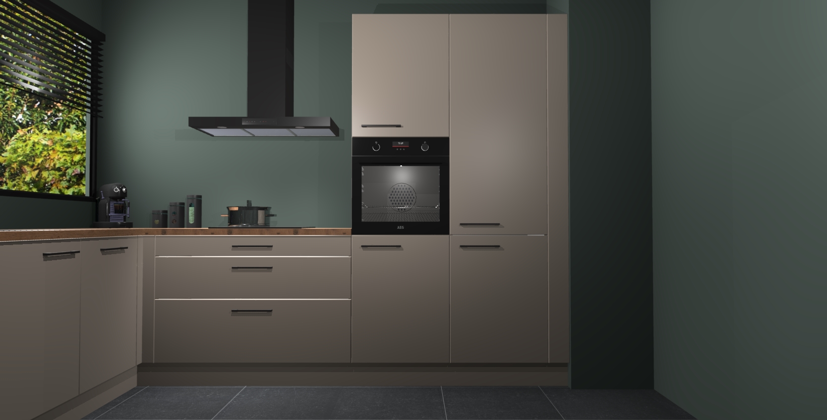 Met een modern, tijdloos design en ruime opslagruimte, zult u zich in no-time thuis voelen in uw nieuwe keuken. Uw leven wordt eenvoudiger met de soft-close deuren die voor het ultieme stille comfort zorgen - geen geluid dat u stoort terwijl u kookt. Ook is de keuken voorzien van 5 ingebouwde apparaten: een oven, inductie kookplaat, afzuigkap, vaatwasser en koelkast. Deze kunnen gemakkelijk na bestelling worden bijgewerkt naar AEG - waardoor uw luxe ervaring compleet is.