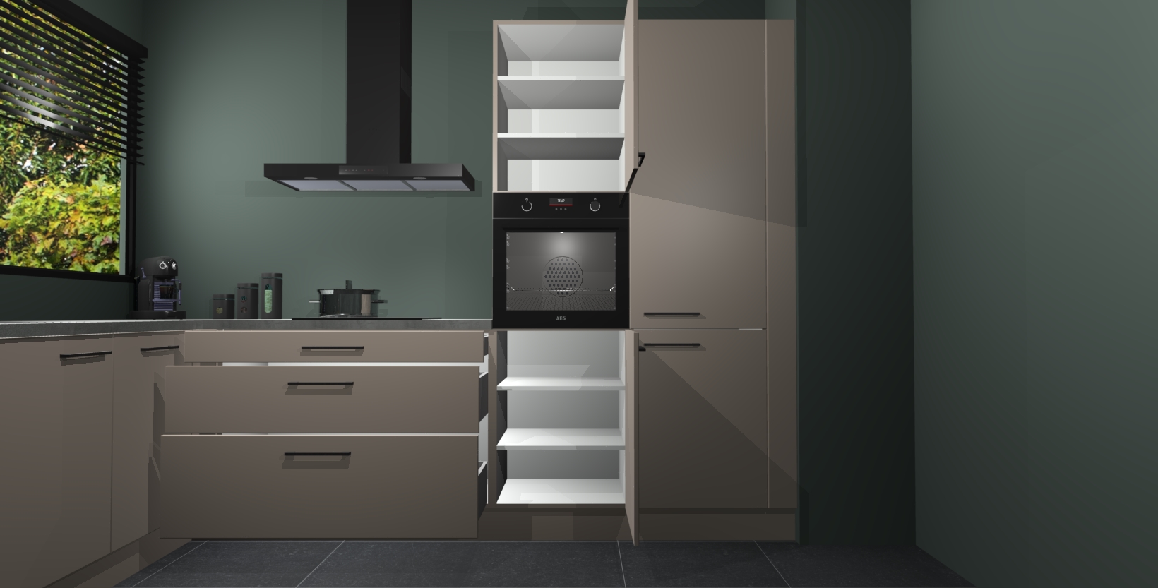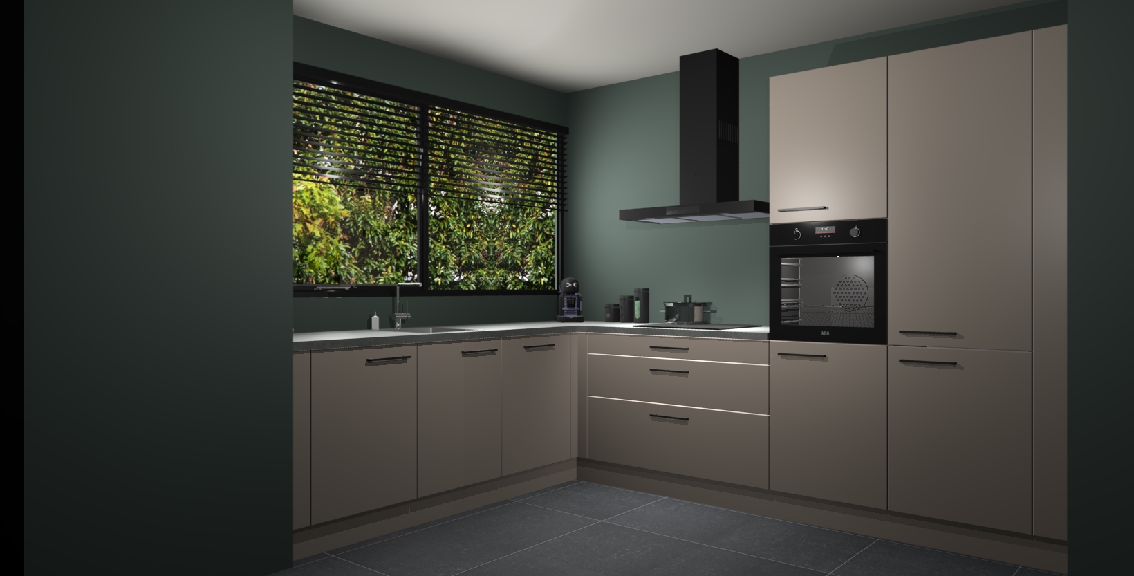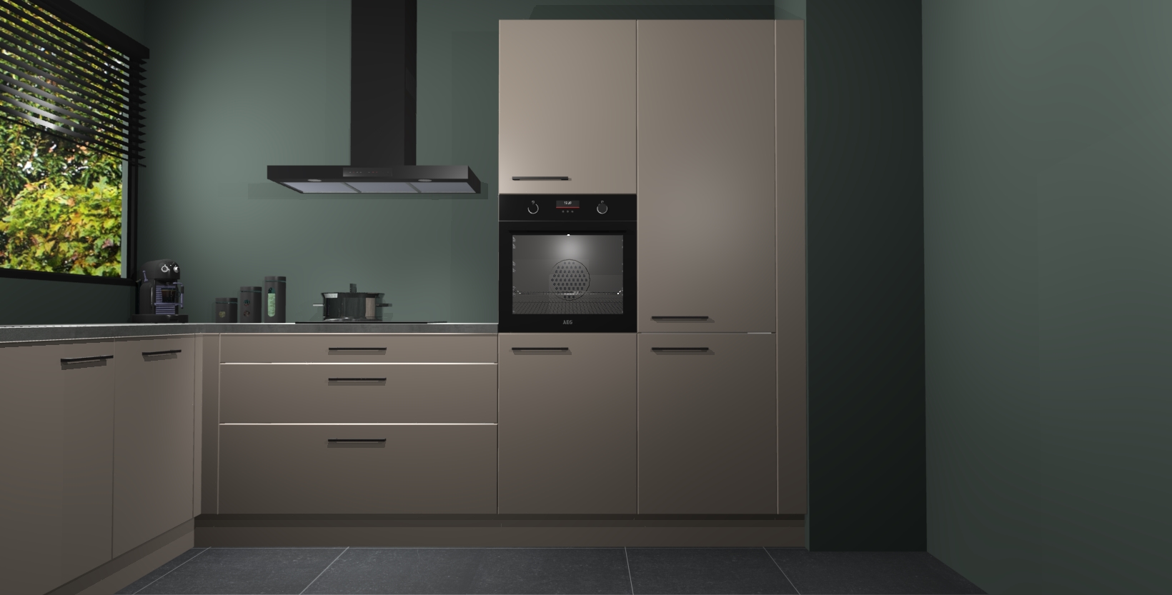 Met een modern, tijdloos design en ruime opslagruimte, zult u zich in no-time thuis voelen in uw nieuwe keuken. Uw leven wordt eenvoudiger met de soft-close deuren die voor het ultieme stille comfort zorgen - geen geluid dat u stoort terwijl u kookt. Ook is de keuken voorzien van 5 ingebouwde apparaten: een oven, inductie kookplaat, afzuigkap, vaatwasser en koelkast. Deze kunnen gemakkelijk na bestelling worden bijgewerkt naar AEG - waardoor uw luxe ervaring compleet is.