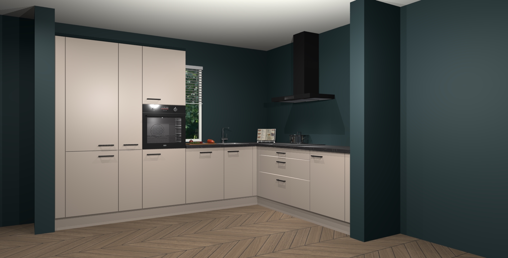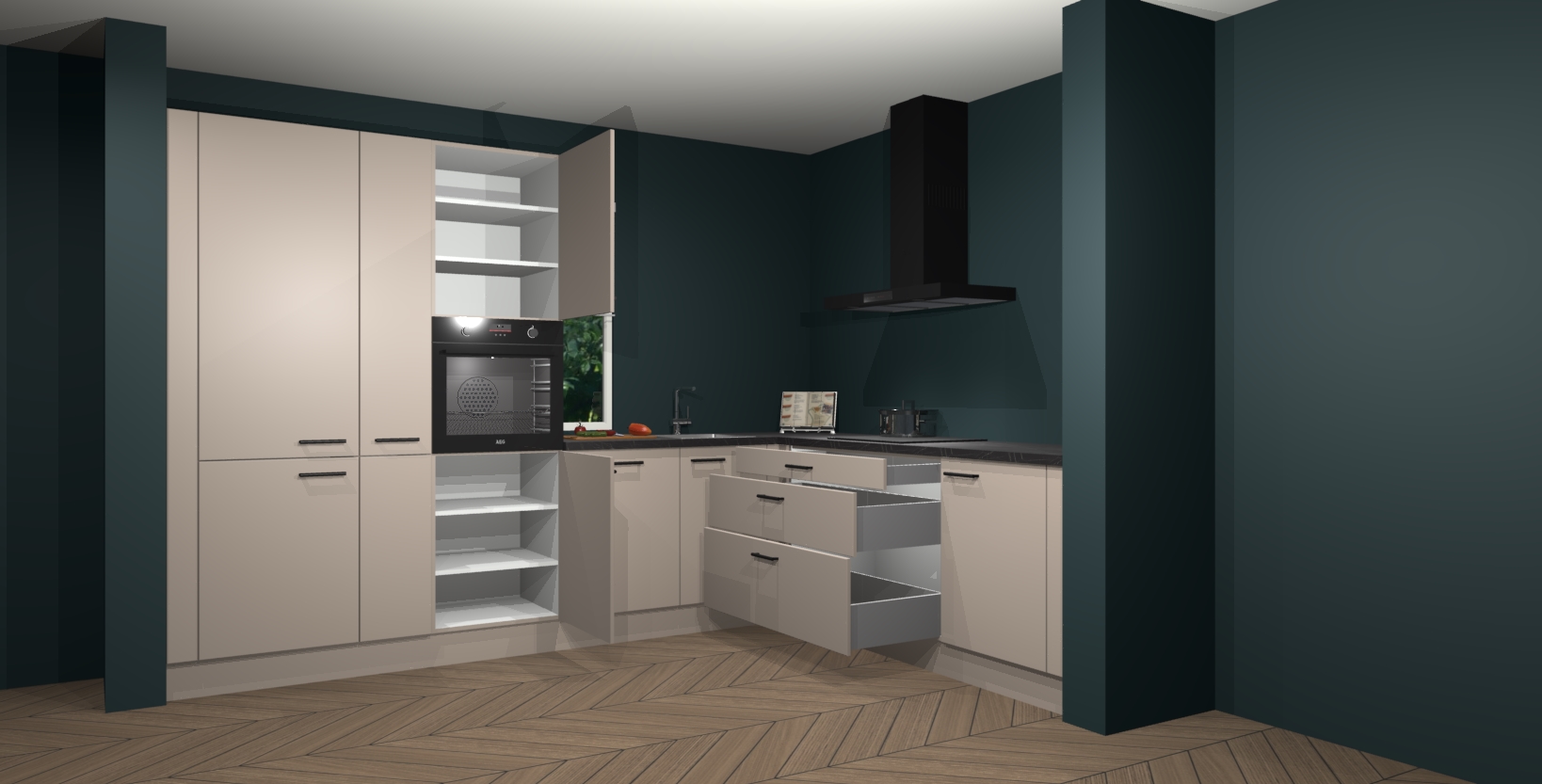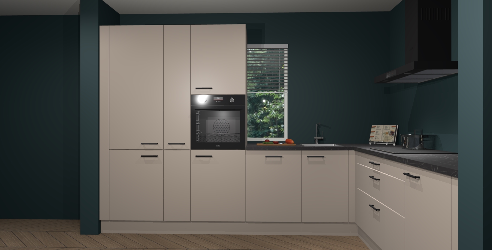 Met een modern, tijdloos design en ruime opslagruimte, zult u zich in no-time thuis voelen in uw nieuwe keuken. Uw leven wordt eenvoudiger met de soft-close deuren die voor het ultieme stille comfort zorgen - geen geluid dat u stoort terwijl u kookt. Ook is de keuken voorzien van 5 ingebouwde apparaten: een oven, inductie kookplaat, afzuigkap, vaatwasser en koelkast. Deze kunnen gemakkelijk na bestelling worden bijgewerkt naar AEG - waardoor uw luxe ervaring compleet is.