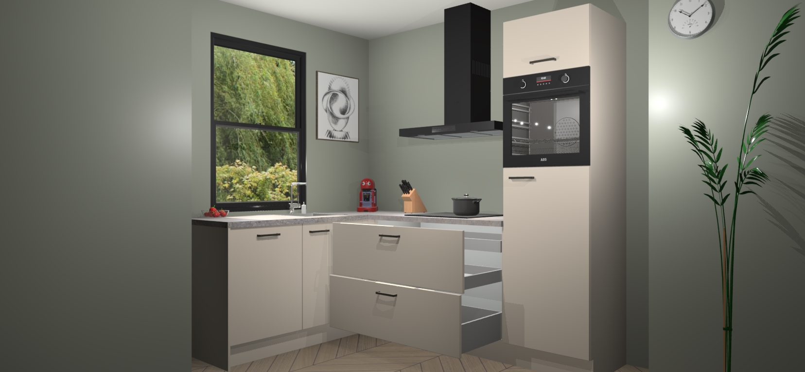 Deze prachtige hoekkeuken heeft alle benodigdheden om uw droomkook- en eetruimte compleet te maken. De Kasjmier kasten bieden een echo van raffinement, terwijl de 5 inbouwapparaten genoeg opties bieden voor het bereiden van heerlijke maaltijden. De oven, inductiekookplaat, afzuigkap, vaatwasser en koelkast zorgen ervoor dat u tijd in de keuken zo efficiënt mogelijk verloopt, terwijl ze ook dat extra vleugje luxe bieden.