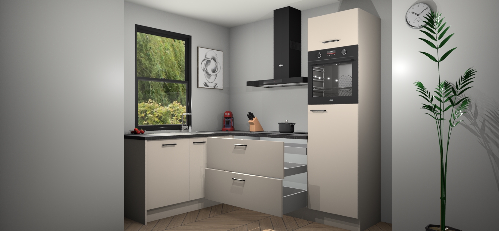 Deze prachtige hoekkeuken heeft alle benodigdheden om uw droomkook- en eetruimte compleet te maken. De Kasjmier kasten bieden een echo van raffinement, terwijl de 5 inbouwapparaten genoeg opties bieden voor het bereiden van heerlijke maaltijden. De oven, inductiekookplaat, afzuigkap, vaatwasser en koelkast zorgen ervoor dat u tijd in de keuken zo efficiënt mogelijk verloopt, terwijl ze ook dat extra vleugje luxe bieden.