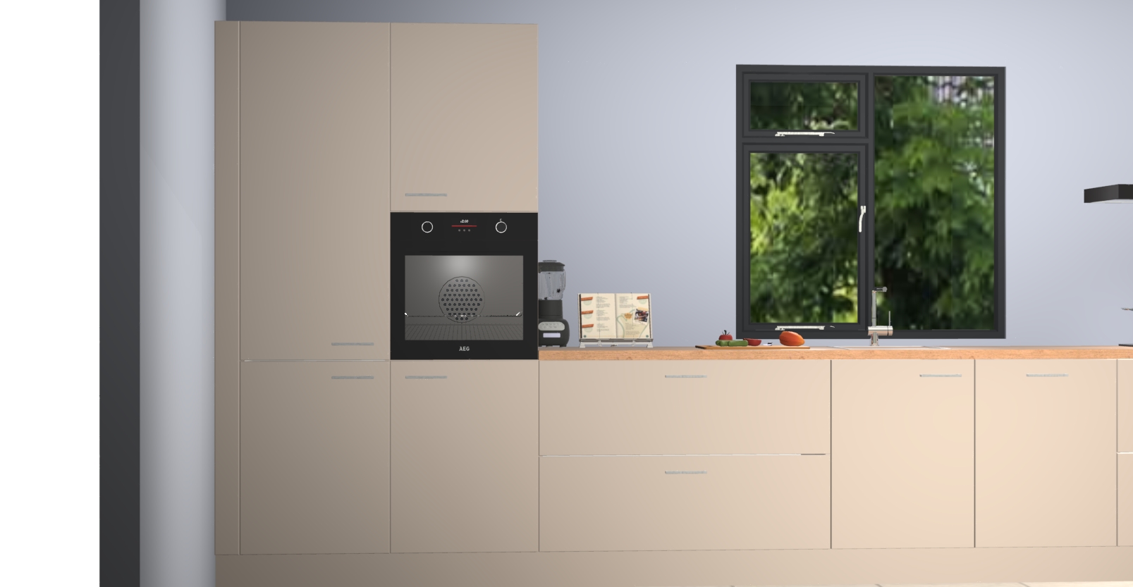De Kasjmier keuken Lille wordt geleverd met vijf inbouwapparaten - een oven, inductiekookplaat, afzuigkap, vaatwasser en koelkast. Maar dat is nog niet alles! Na bestelling kunnen deze apparaten eenvoudig worden geüpgraded naar premium AEG-apparatuur. Bovendien is er zelfs de optie om de oven te vervangen door een combimagnetron of uw inductiekookplaat te vervangen door een kookplaat met geïntegreerde afzuiging.
