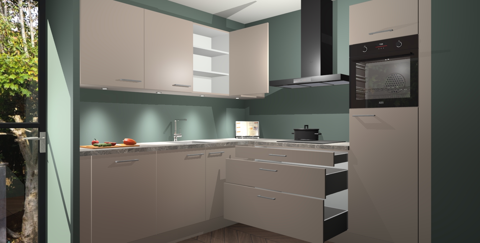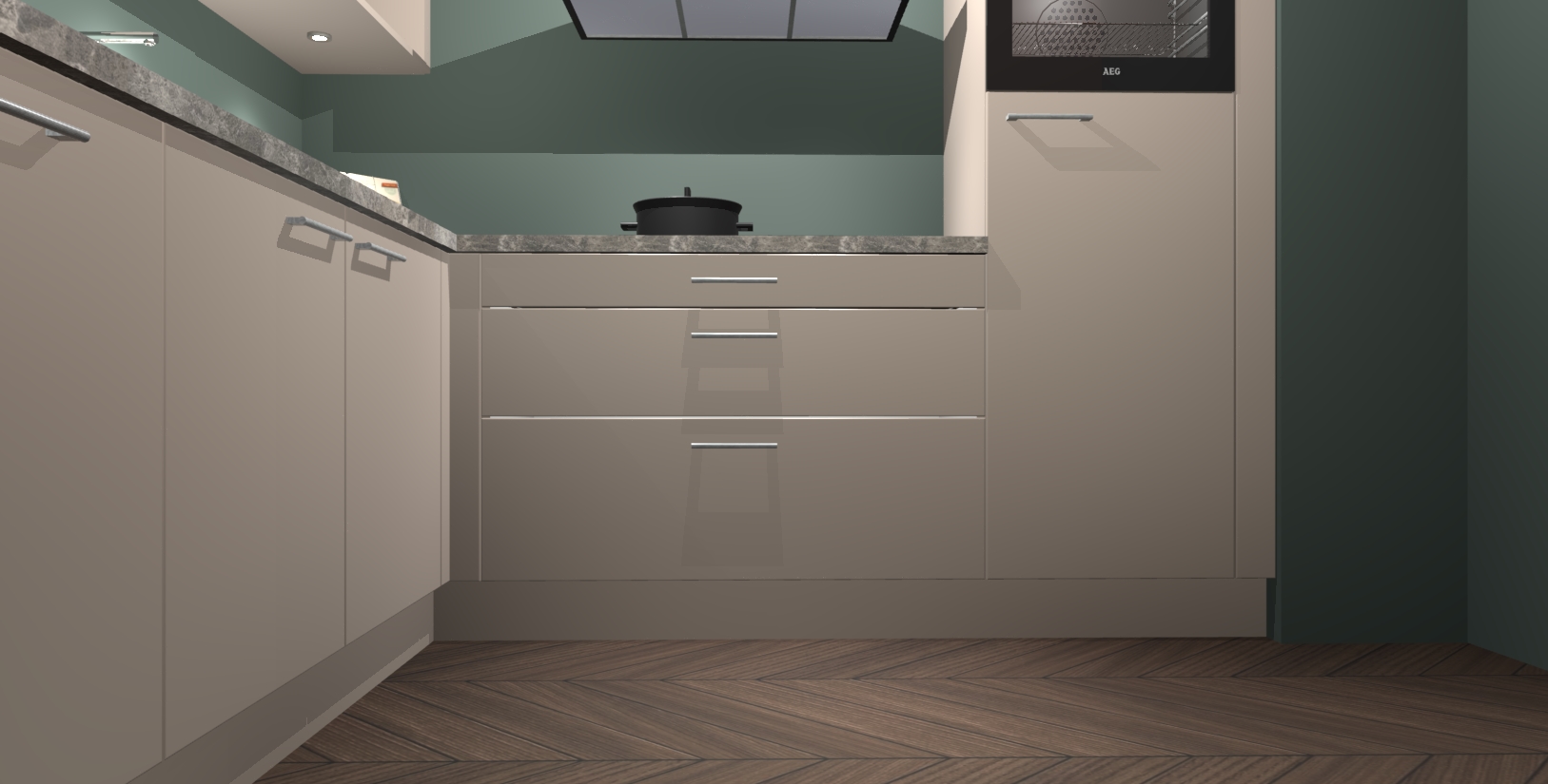 Met een modern, tijdloos design en ruime opslagruimte, zult u zich in no-time thuis voelen in uw nieuwe keuken. Uw leven wordt eenvoudiger met de soft-close deuren die voor het ultieme stille comfort zorgen - geen geluid dat u stoort terwijl u kookt. Ook is de keuken voorzien van 5 ingebouwde apparaten: een oven, inductie kookplaat, afzuigkap, vaatwasser en koelkast. Deze kunnen gemakkelijk na bestelling worden bijgewerkt naar AEG - waardoor uw luxe ervaring compleet is.
