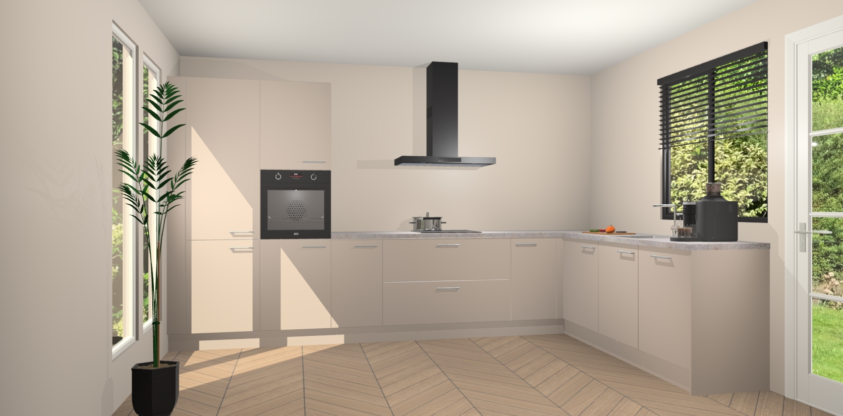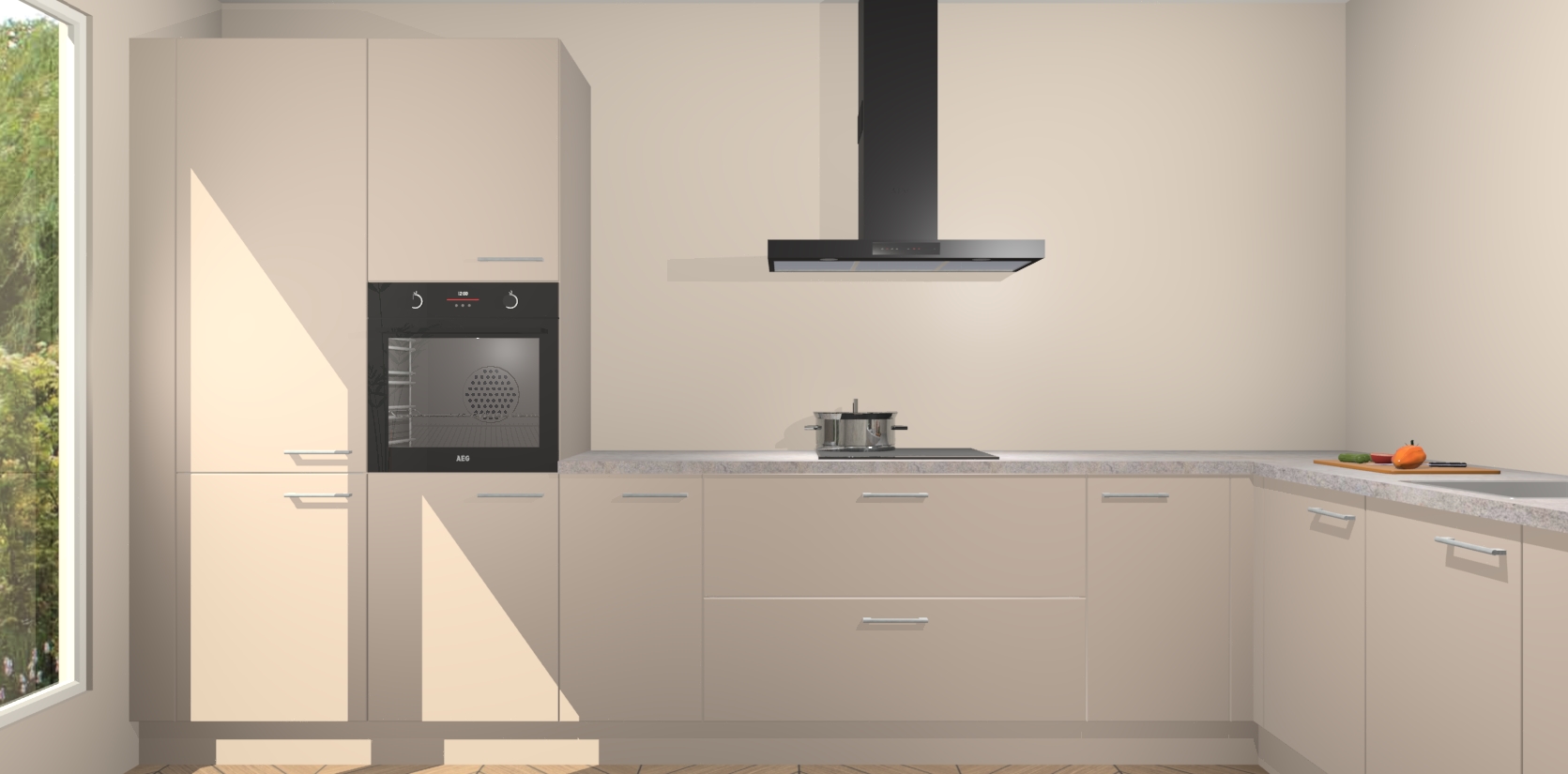 Met een modern, tijdloos design en ruime opslagruimte, zult u zich in no-time thuis voelen in uw nieuwe keuken. Uw leven wordt eenvoudiger met de soft-close deuren die voor het ultieme stille comfort zorgen - geen geluid dat u stoort terwijl u kookt. Ook is de keuken voorzien van 5 ingebouwde apparaten: een oven, inductie kookplaat, afzuigkap, vaatwasser en koelkast. Deze kunnen gemakkelijk na bestelling worden bijgewerkt naar AEG - waardoor uw luxe ervaring compleet is.