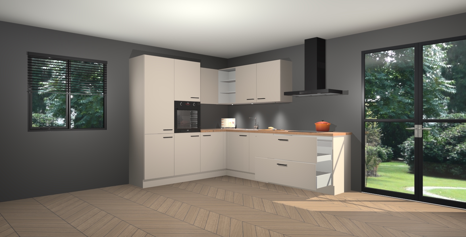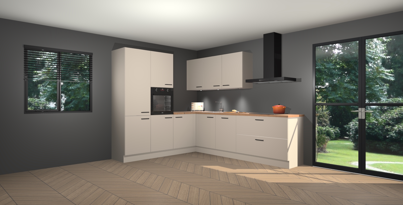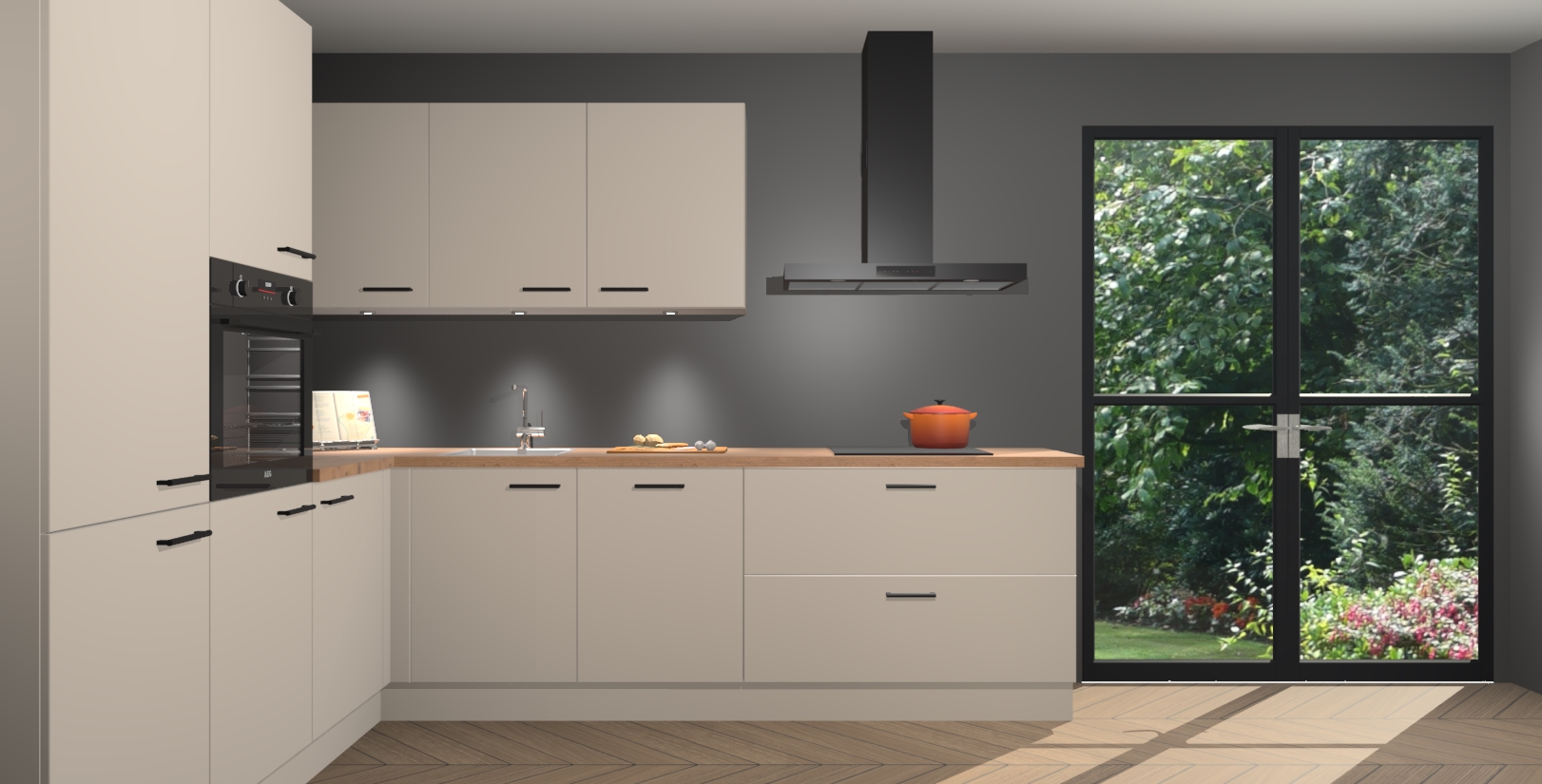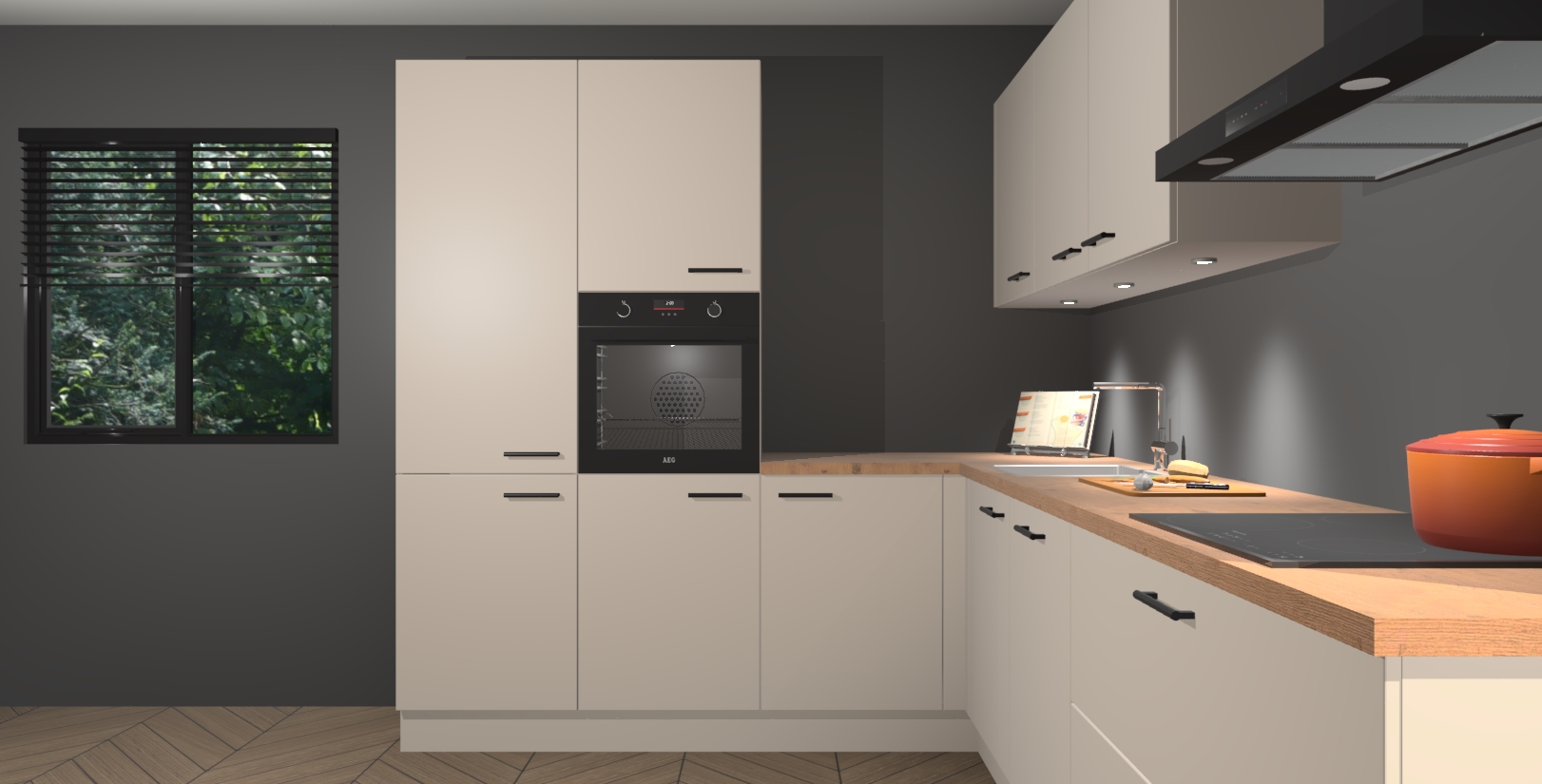 Maak kennis met de kasjmier keuken Parla - de perfecte aanvulling voor uw moderne keuken! Ervaar tijdloos design, elegantie en een chique uitstraling met onze zwarte handgrepen, soft-close deuren en veel opbergruimte. Dit alles wordt aangeboden tegen een vaste lage prijs voor ongeëvenaarde Duitse keukenkwaliteit!