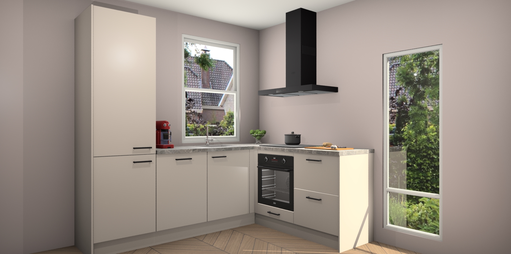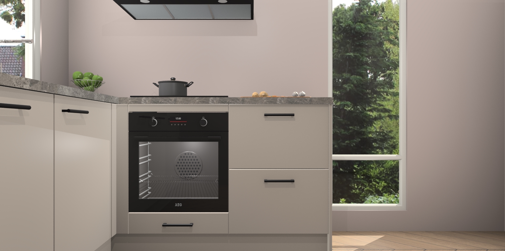 De Kasjmier keuken Phuket heeft alles wat u maar kunt wensen. Niet alleen zijn er softclose deuren, maar ook 5 ingebouwde apparaten: een oven, inductiekookplaat, afzuigkap, vaatwasser en koelkast - waarbij u later gemakkelijk naar het AEG merk, van inductiekookplaat naar kookplaat met geïntegreerde afzuiging of van oven naar combimagnetron kunt upgraden. Dat alles tegen een vast laag tarief! Bovendien geeft de Kasjmier keuken Phuket supersnelle levering van 7 weken. Echt iets voor u als u er niet op wilt wachten om het resultaat te zien in eigen keuken!