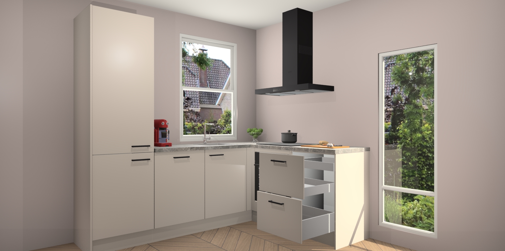 De prachtige Kasjmier keuken Phuket is de perfecte keuze als u op zoek bent naar een moderne hoekkeuken met alle luxe en comfort die u kunt verwachten! De uitstraling in het houtlook-design draagt bij aan de warme sfeer die u nu al voelt wanneer u er naar kijkt. Heeft u genoeg van ouderwetse keukens? Probeer dan direct deze moderne, mooie hoekkeukens en laat iedereen verbluft achter!