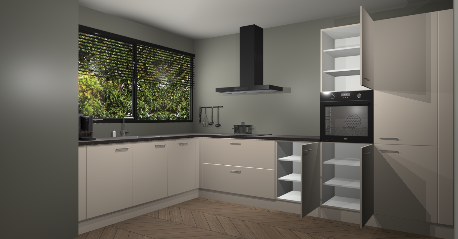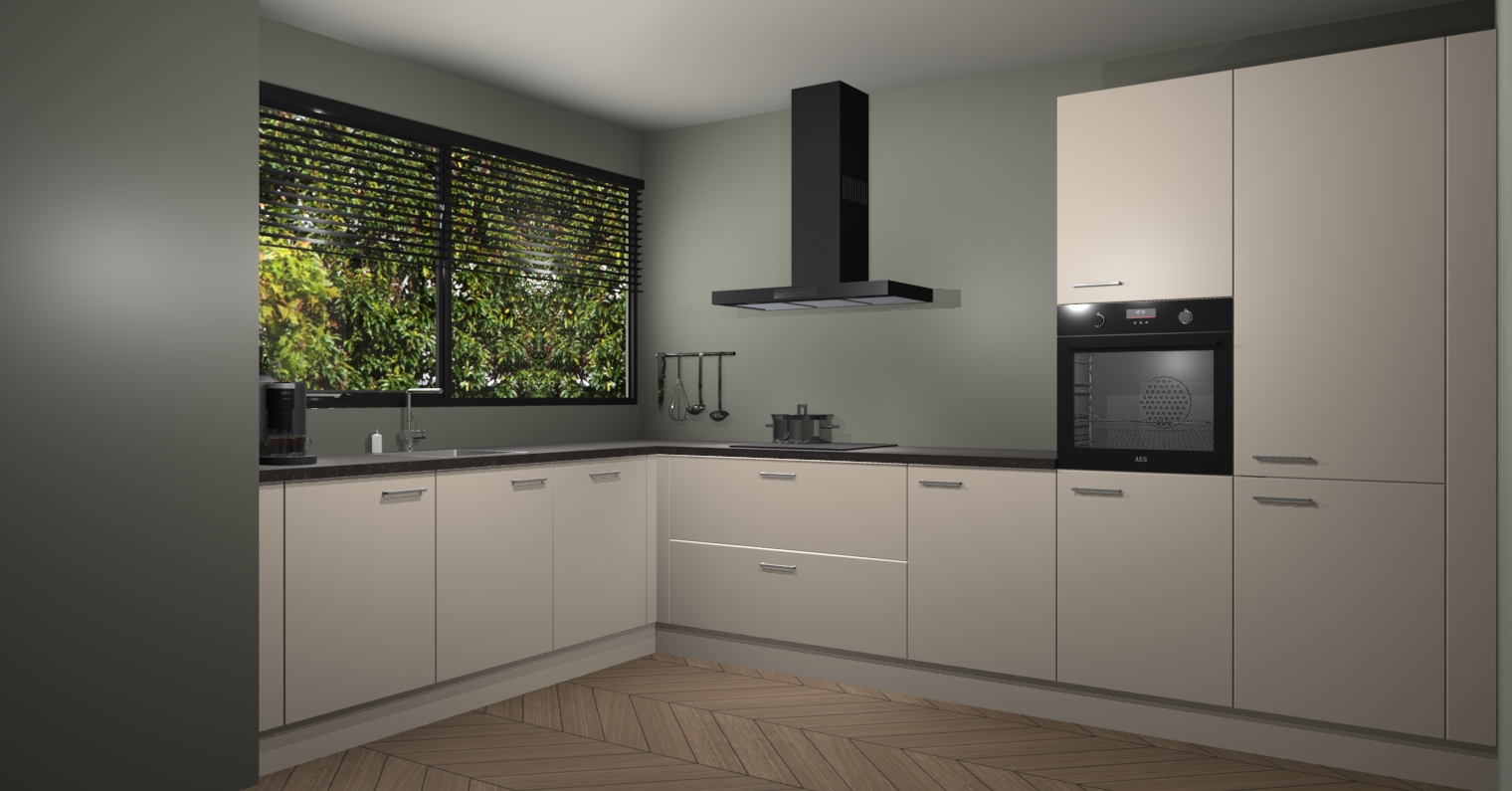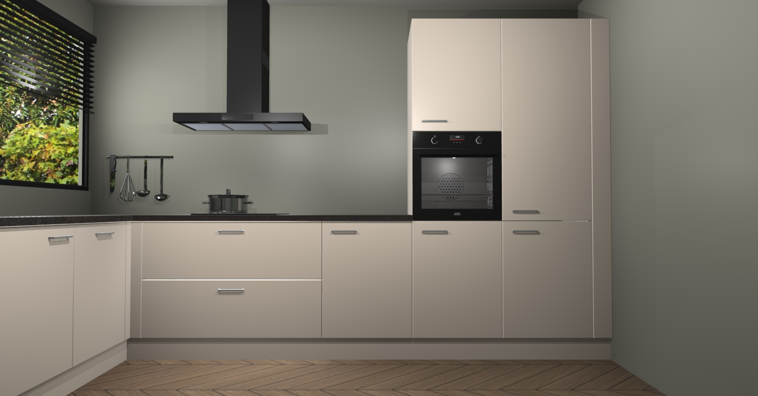 Met een modern, tijdloos design en ruime opslagruimte, zult u zich in no-time thuis voelen in uw nieuwe keuken. Uw leven wordt eenvoudiger met de soft-close deuren die voor het ultieme stille comfort zorgen - geen geluid dat u stoort terwijl u kookt. Ook is de keuken voorzien van 5 ingebouwde apparaten: een oven, inductie kookplaat, afzuigkap, vaatwasser en koelkast. Deze kunnen gemakkelijk na bestelling worden bijgewerkt naar AEG - waardoor uw luxe ervaring compleet is.