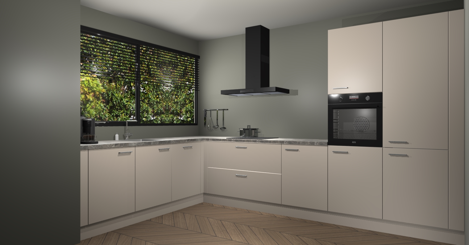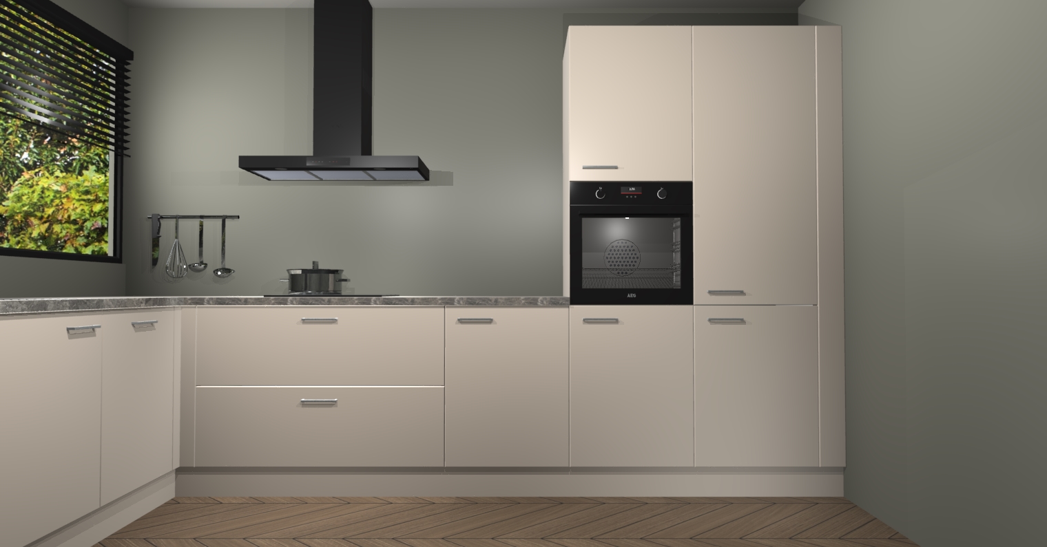 Met een modern, tijdloos design en ruime opslagruimte, zult u zich in no-time thuis voelen in uw nieuwe keuken. Uw leven wordt eenvoudiger met de soft-close deuren die voor het ultieme stille comfort zorgen - geen geluid dat u stoort terwijl u kookt. Ook is de keuken voorzien van 5 ingebouwde apparaten: een oven, inductie kookplaat, afzuigkap, vaatwasser en koelkast. Deze kunnen gemakkelijk na bestelling worden bijgewerkt naar AEG - waardoor uw luxe ervaring compleet is.