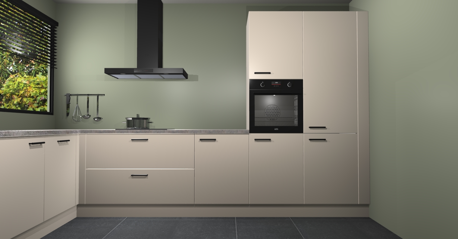 Met een modern, tijdloos design en ruime opslagruimte, zult u zich in no-time thuis voelen in uw nieuwe keuken. Uw leven wordt eenvoudiger met de soft-close deuren die voor het ultieme stille comfort zorgen - geen geluid dat u stoort terwijl u kookt. Ook is de keuken voorzien van 5 ingebouwde apparaten: een oven, inductie kookplaat, afzuigkap, vaatwasser en koelkast. Deze kunnen gemakkelijk na bestelling worden bijgewerkt naar AEG - waardoor uw luxe ervaring compleet is.