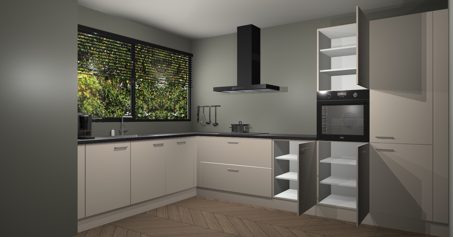 Met een modern, tijdloos design en ruime opslagruimte, zult u zich in no-time thuis voelen in uw nieuwe keuken. Uw leven wordt eenvoudiger met de soft-close deuren die voor het ultieme stille comfort zorgen - geen geluid dat u stoort terwijl u kookt. Ook is de keuken voorzien van 5 ingebouwde apparaten: een oven, inductie kookplaat, afzuigkap, vaatwasser en koelkast. Deze kunnen gemakkelijk na bestelling worden bijgewerkt naar AEG - waardoor uw luxe ervaring compleet is.
