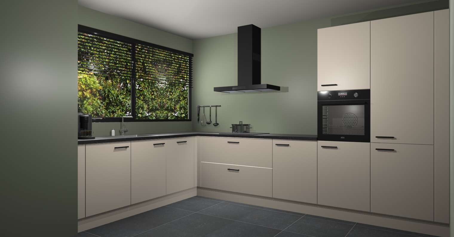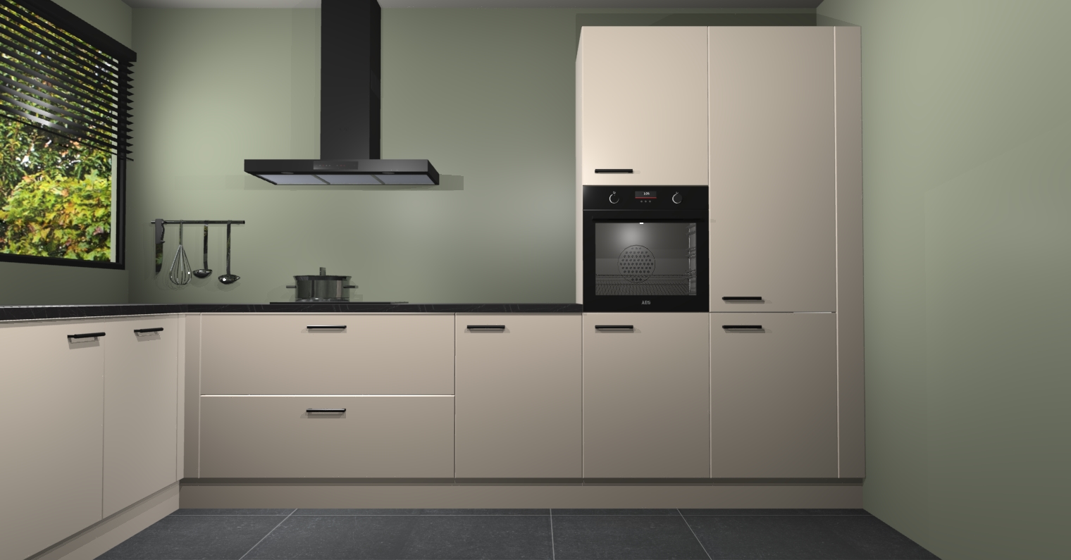 Met een modern, tijdloos design en ruime opslagruimte, zult u zich in no-time thuis voelen in uw nieuwe keuken. Uw leven wordt eenvoudiger met de soft-close deuren die voor het ultieme stille comfort zorgen - geen geluid dat u stoort terwijl u kookt. Ook is de keuken voorzien van 5 ingebouwde apparaten: een oven, inductie kookplaat, afzuigkap, vaatwasser en koelkast. Deze kunnen gemakkelijk na bestelling worden bijgewerkt naar AEG - waardoor uw luxe ervaring compleet is.
