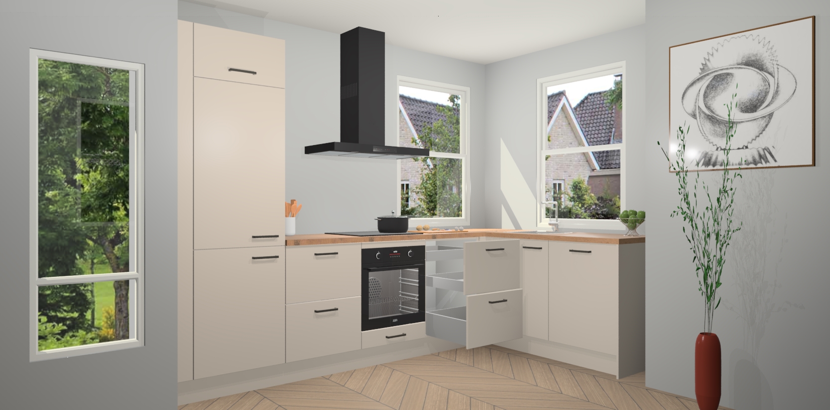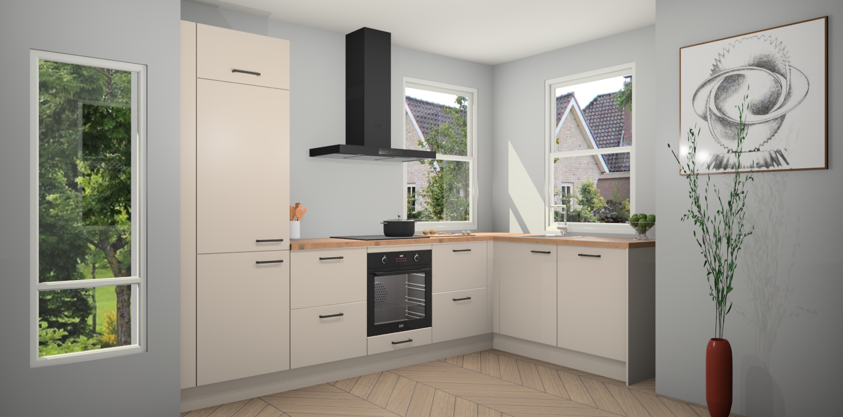 Wat maakt deze keuken zo bijzonder? Ten eerste geeft het houten werkblad uw ruimte een onmiskenbaar klassieke uitstraling. De natuurlijke afwerking roept warmte en elegantie op die nooit uit de mode zullen raken. Bovendien is het gemakkelijk schoon te houden en te onderhouden, zodat je er jarenlang plezier van kunt hebben. Als u op zoek bent naar extra gemak in uw keuken, dan heeft u bij het plaatsen van een bestelling bij ons ook de optie om uw toestellen te upgraden naar AEG-modellen - zo haalt u moderne innovatie van topmerken in apparatentechnologie rechtstreeks in huis.