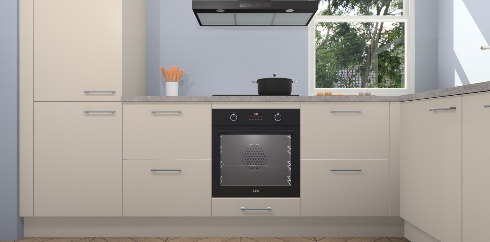 Wat maakt deze keuken zo bijzonder? Ten eerste geeft het houten werkblad uw ruimte een onmiskenbaar klassieke uitstraling. De natuurlijke afwerking roept warmte en elegantie op die nooit uit de mode zullen raken. Bovendien is het gemakkelijk schoon te houden en te onderhouden, zodat je er jarenlang plezier van kunt hebben. Als u op zoek bent naar extra gemak in uw keuken, dan heeft u bij het plaatsen van een bestelling bij ons ook de optie om uw toestellen te upgraden naar AEG-modellen - zo haalt u moderne innovatie van topmerken in apparatentechnologie rechtstreeks in huis.