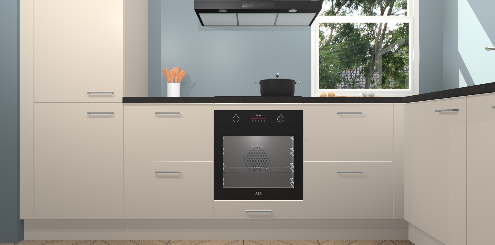 Wat maakt deze keuken zo bijzonder? Ten eerste geeft het houten werkblad uw ruimte een onmiskenbaar klassieke uitstraling. De natuurlijke afwerking roept warmte en elegantie op die nooit uit de mode zullen raken. Bovendien is het gemakkelijk schoon te houden en te onderhouden, zodat je er jarenlang plezier van kunt hebben. Als u op zoek bent naar extra gemak in uw keuken, dan heeft u bij het plaatsen van een bestelling bij ons ook de optie om uw toestellen te upgraden naar AEG-modellen - zo haalt u moderne innovatie van topmerken in apparatentechnologie rechtstreeks in huis.